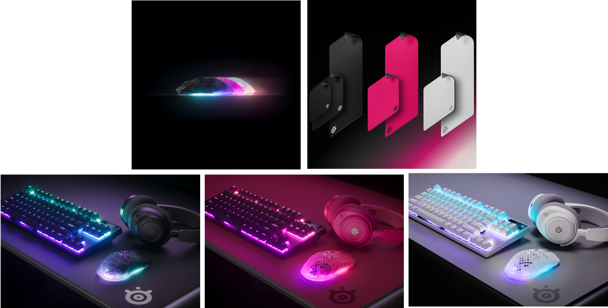 ※マウス「Aerox 3 Wireless Gen 2」、マウスパッド「QcK Heavy」、ヘッドセット「Arctis Nova 7 Gen 2」で組み合わせた3色のセットアップイメージ
