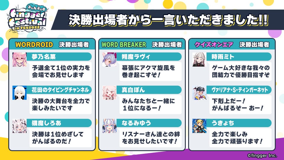 東京ゲームショウ2022会場に足を運ぶ方はもちろん、finggerやfingger公式YouTubeチャンネルでの配信も予定しておりますので、ご自宅からもぜひご視聴・ご参加ください。