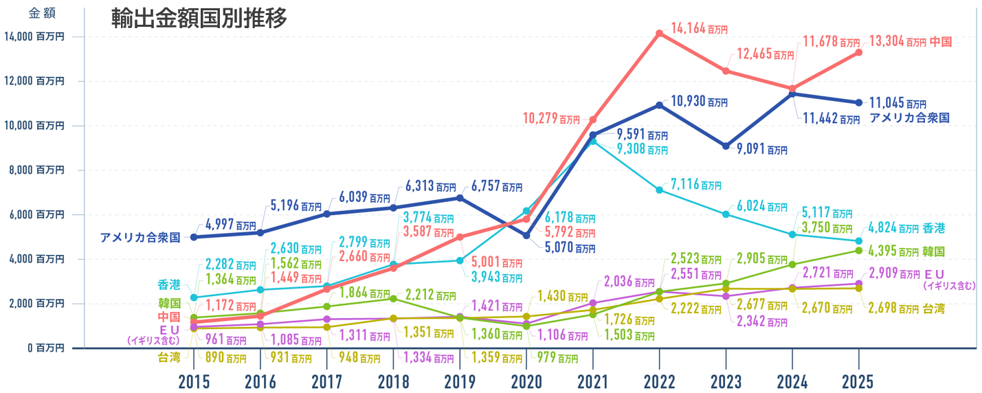 輸出金額1位は中国、輸出数量1位はアメリカ。輸出相手国は過去最高の81ヵ国に。