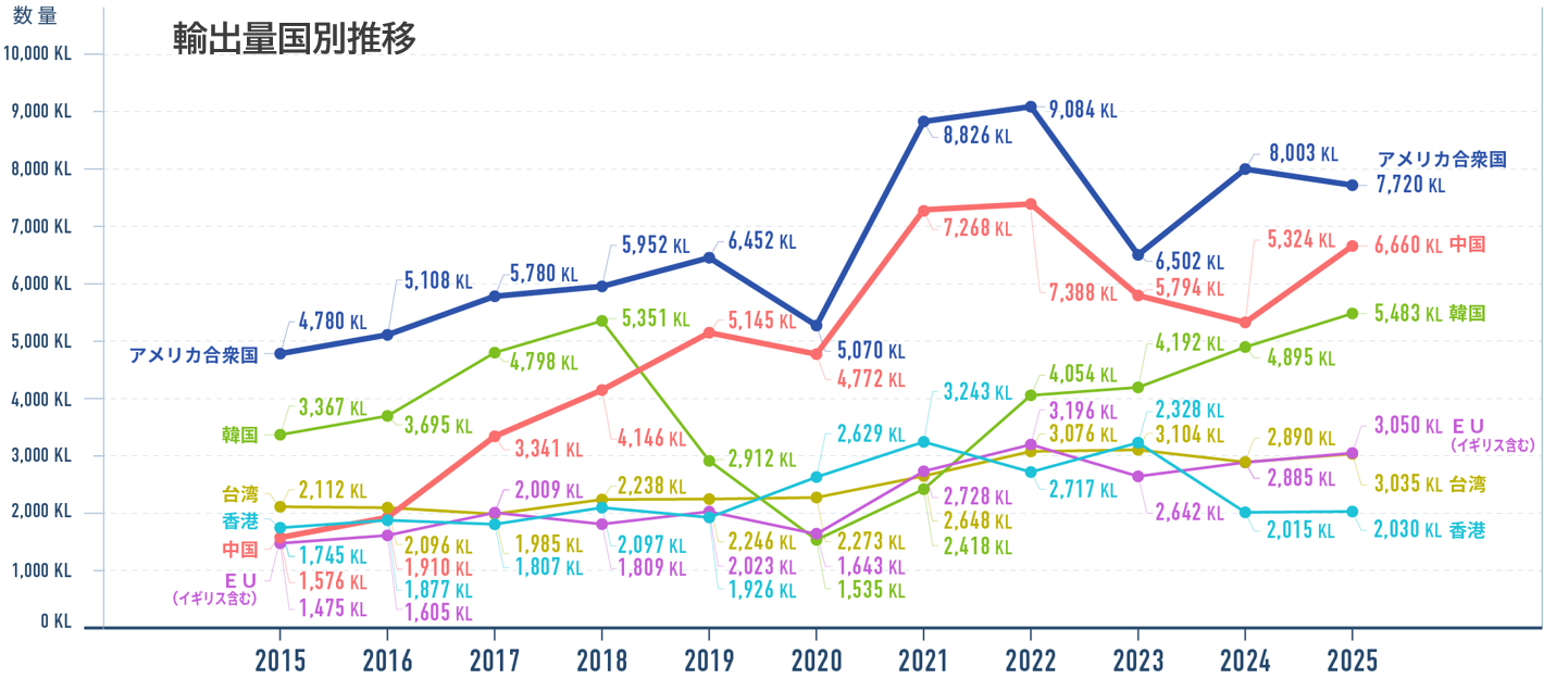 一方、輸出数量ではアメリカが第1位となり、約7,720㎘(前年比約97%)となりました。輸出金額については約111億円(前年比約97%、第2位)となり、数量・金額ともに前年をわずかに下回る結果となりました。