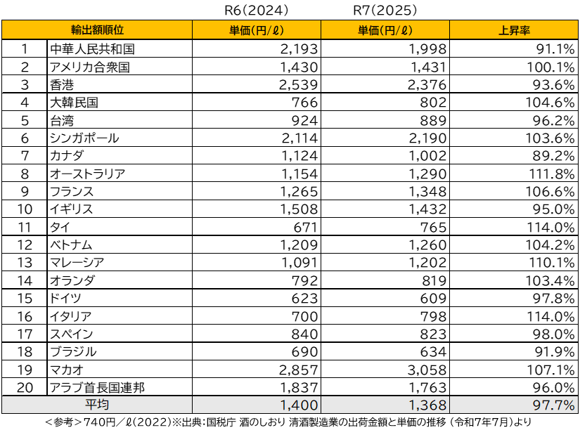 1ℓあたりの日本酒の輸出単価は、過去最高額を記録した2022年以降、ほぼ横ばいで推移しています。香港、シンガポール、マカオにおいては、引き続き2,000円/ℓを超える水準となっています。10年前(2015年)の平均輸出単価は771円/ℓでしたが、2025年には1,368円/ℓとなり、約1.8倍に上昇しました。比較的高価格帯の日本酒が世界市場を牽引する傾向は、継続しています。