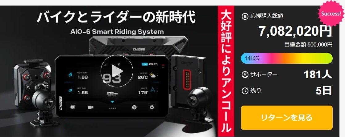 バイク用スマートライドモニター「AIO-6」がMakuakeで8,000万円の大台突破!豪華3大抽選キャンペーン同時開催中