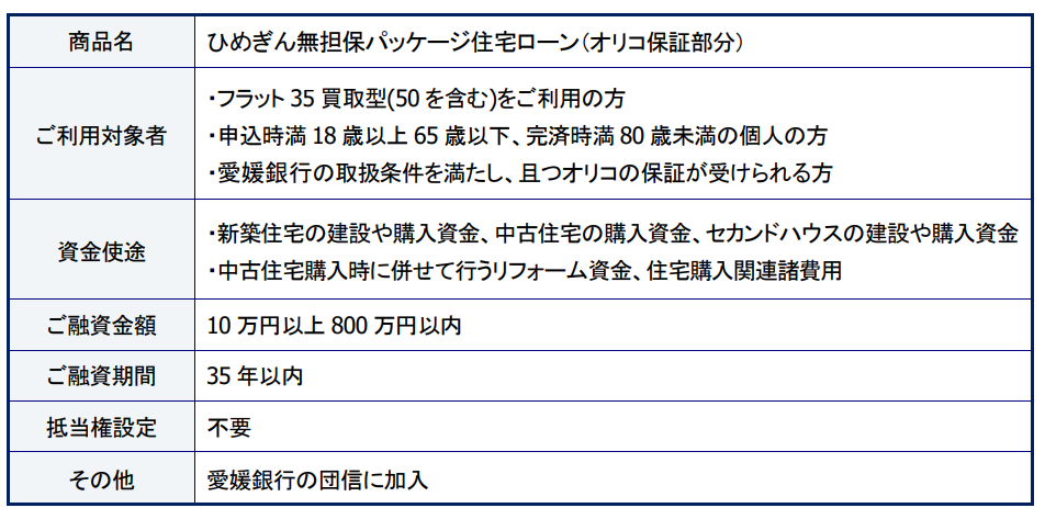 株式会社オリエントコーポレーション(東京都千代田区、代表取締役社長:飯盛 徹夫、以下「オリコ」)は、株式会社愛媛銀行(愛媛県松山市、頭取:西川 義教、以下「愛媛銀行」)と提携し、フラット35※とオリコが保証する住宅ローンを組み合わせた「ひめぎん無担保パッケージ住宅ローン」の取り扱いを、2022年10月31日より開始いたします。