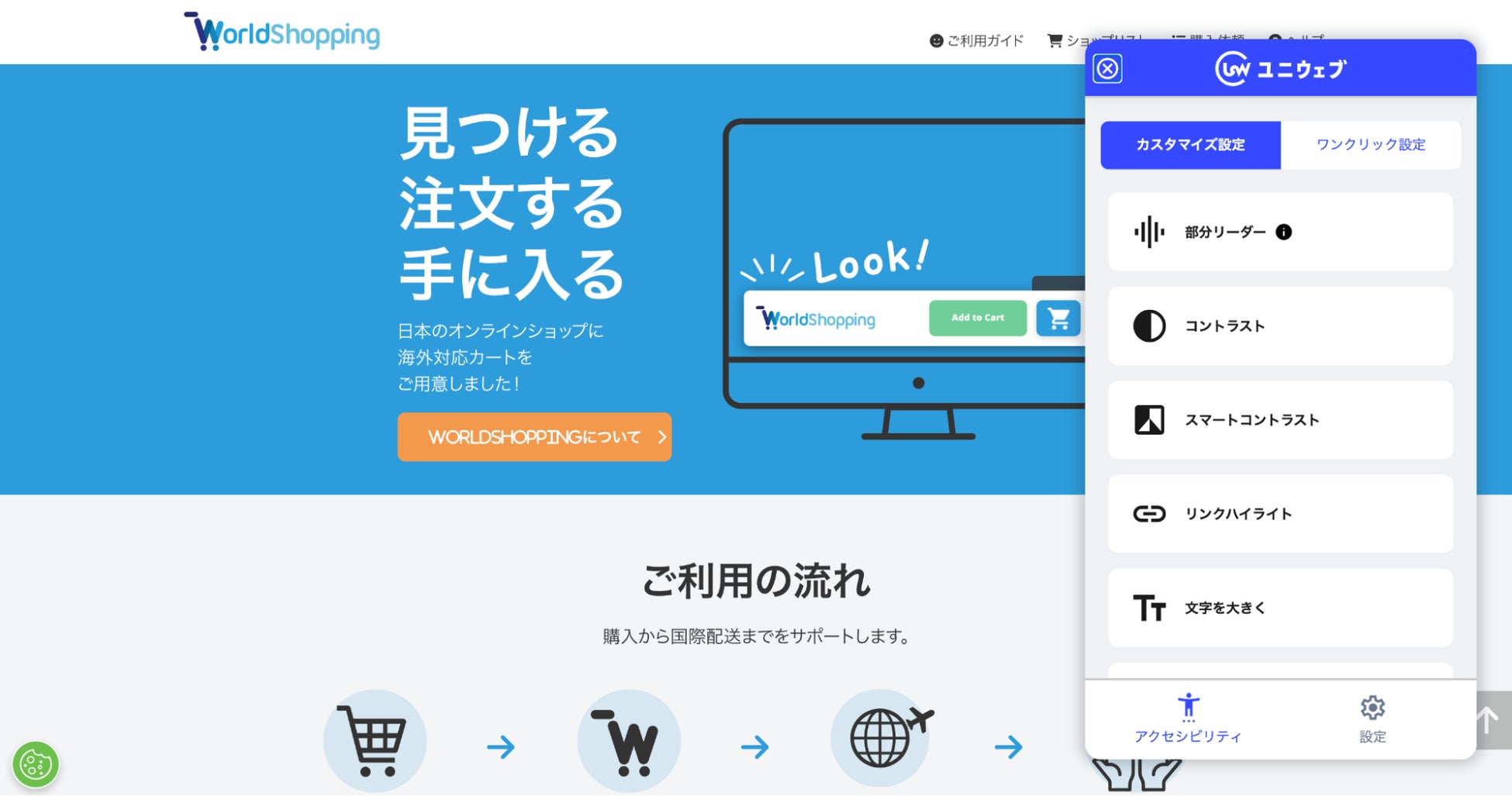 ユニウェブは、すべてのウェブサービスにコードを一行追加するだけで「導入当日」にウェブアクセシビリティ機能をサポートします。
