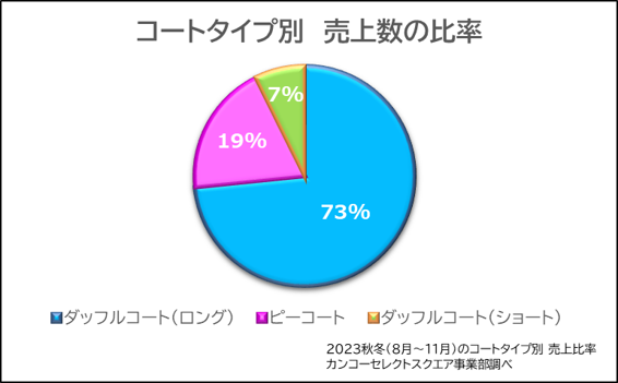 コート売り上げの約7割がダッフルコートのロング丈、2割がピーコート。残りの1割未満がダッフルコートのショート丈であるという結果になりました。