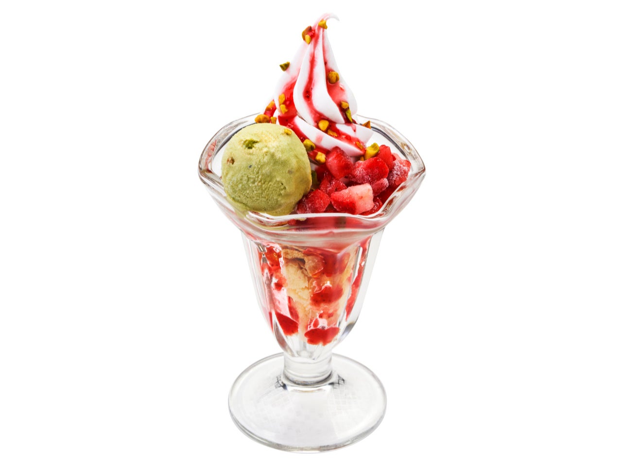 スポンジ生地とストロベリーソースを使用し、ソフトクリーム、ピスタチオアイス、ダイス状のストロベリー、刻みピスタチオを重ねた華やかなパフェです。ストロベリーの赤とピスタチオの緑で見た目もクリスマスらしく仕上げました。スポンジ生地にストロベリーソースが染み込み、さらにまろやかなピスタチオアイスと甘酸っぱいストロベリーソースが絶妙にマッチした逸品です。