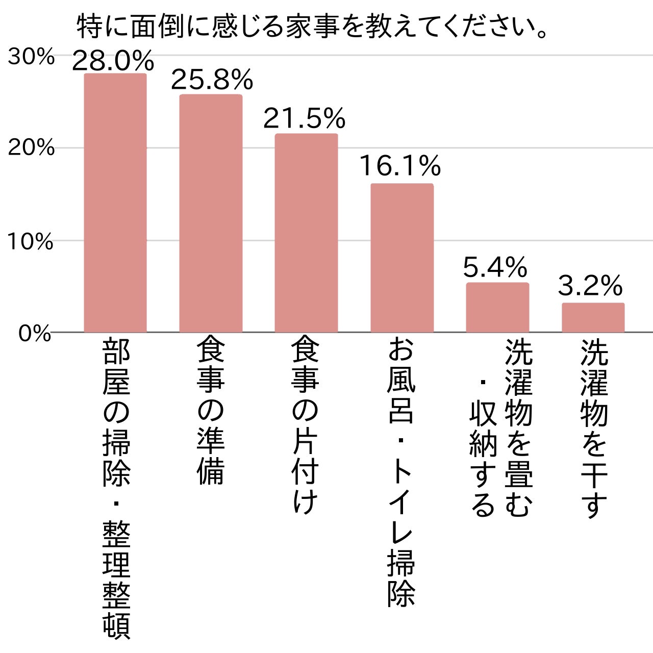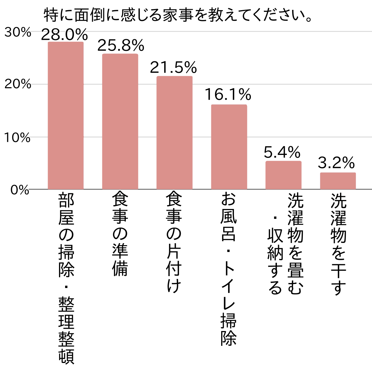 アンケートのトップは「部屋の掃除・整理整頓」で約3割(関東第1位・28.0%・全国第2位・29.3%)でした。