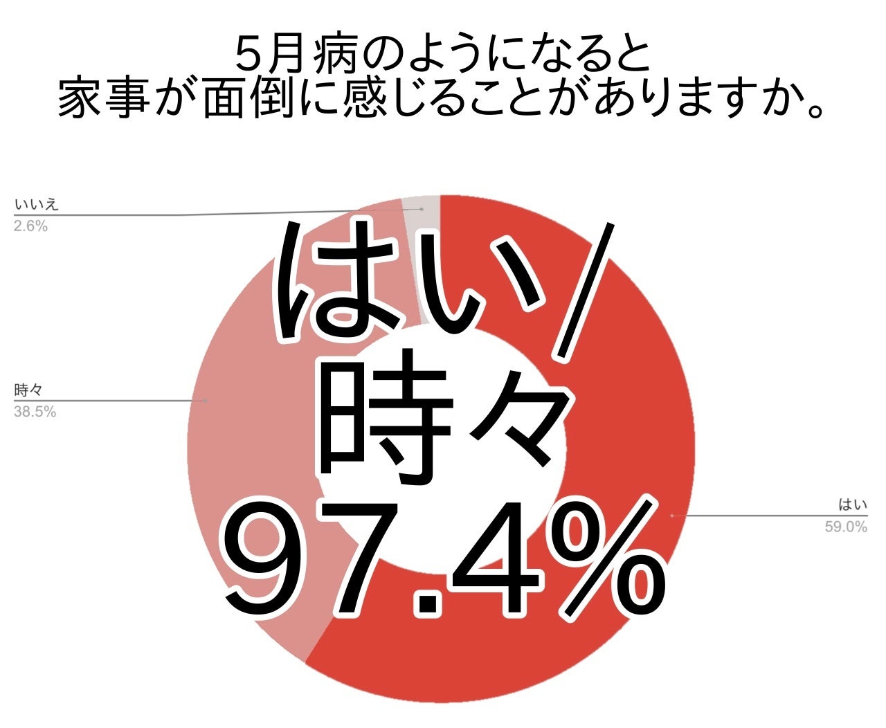 アンケートでは、GWのあとなどに5月病のようになることが少しでもある方は約6割で、5月病のようになると家事が面倒に感じると答えた方は9割以上でした。特に、掃除・整理整頓、食事の用意や片付けが大変と感じている方が多く見受けられました。