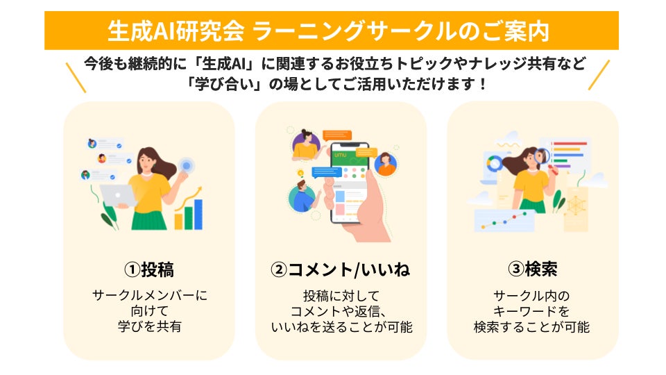 セッション後も継続的に「生成AI」に関連するお役立ちトピックやナレッジ共有など、他社で同様のお取り組みをされている企業様と「学び合い」の場として「ラーニングサークル」をご活用いただけます。