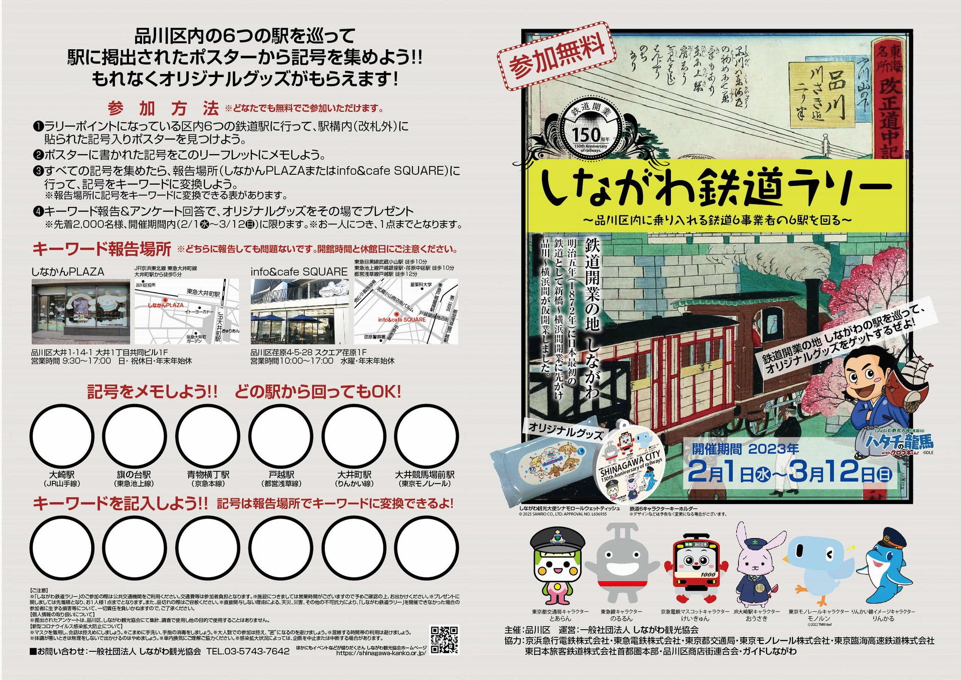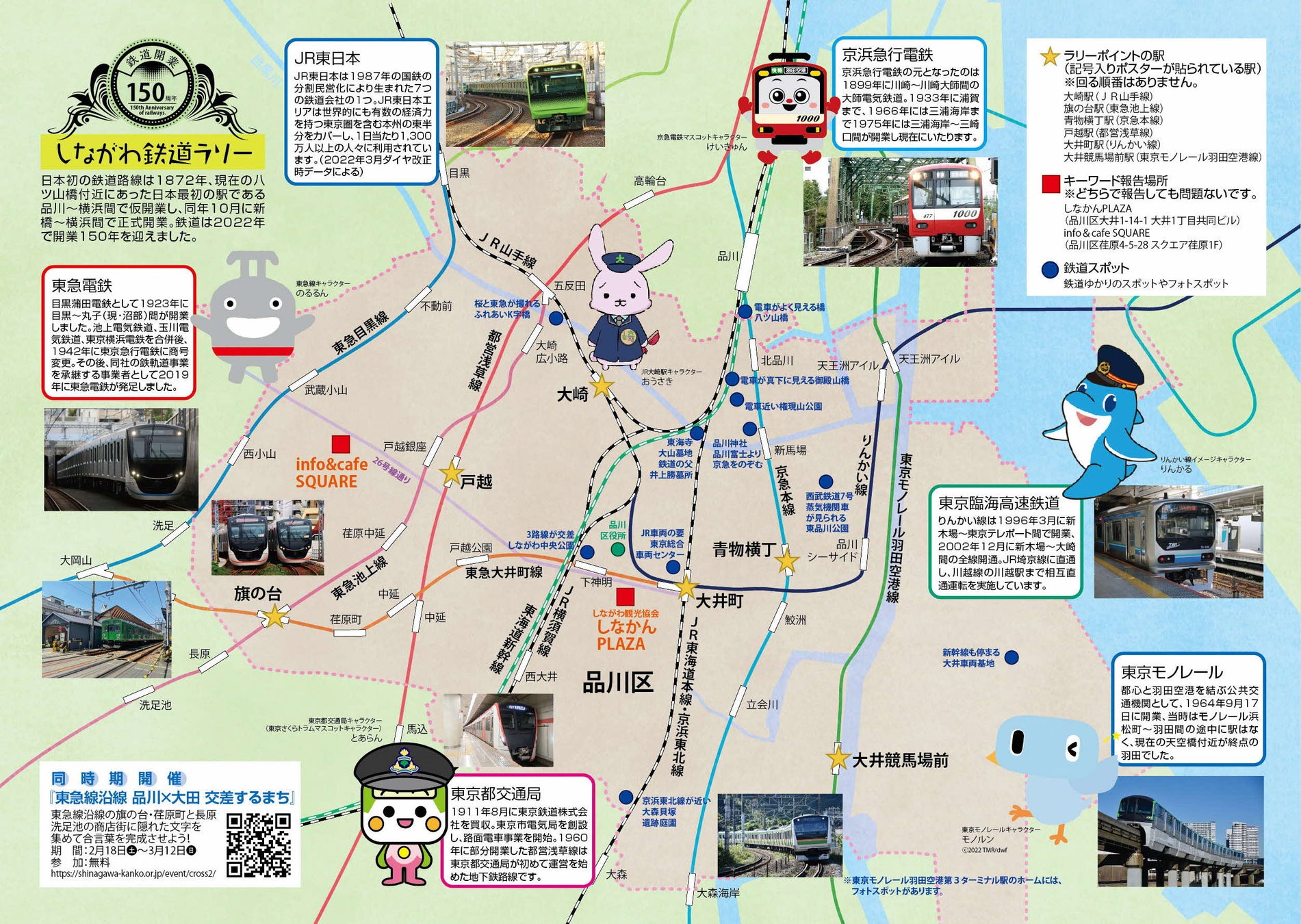 品川区は2月1日~3月12日、区内に乗り入れる6鉄道事業者(京浜急行電鉄株式会社・東急電鉄株式会社・東京都交通局・東京モノレール株式会社・東京臨海高速鉄道株式会社、東日本旅客鉄道株式会社首都圏本部)協力を得て、鉄道開業150周年記念「しながわ鉄道ラリー」を開催します。