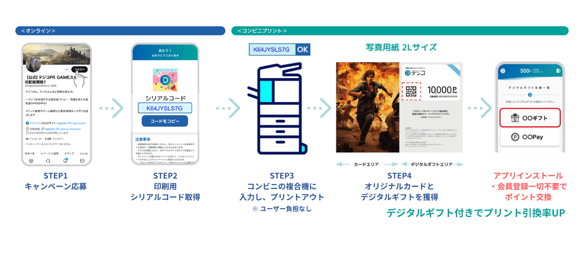 企業がオンラインでお客さまに印刷用シリアルコードを配布して、受け取ったお客さまはお近くのコンビニのマルチコピー機でシリアルコードを入力すると、オリジナルデザインのフォトカード(2L判写真用紙)が無料でもらえるサービスです。ゲームやアニメなどのキャラクターコンテンツのキャンペーンの景品としてもおすすめです。また、オリジナルカードにはデジタルギフト「デジコ」を受け取ることができる二次元コードを付けることも可能です。