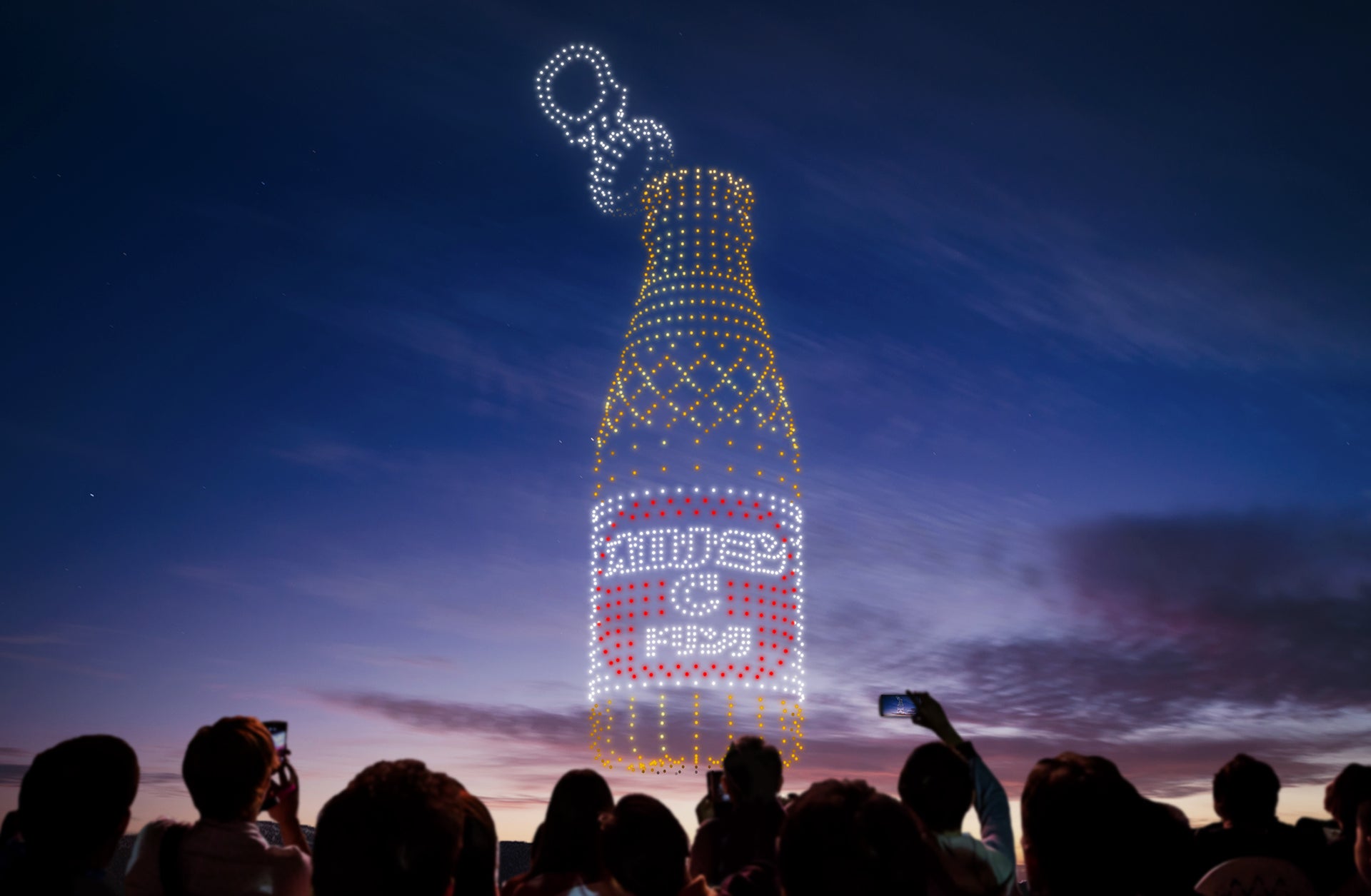 今回のドローンショーでは、ブランド史上最大となる縦約225m×横約65mの「巨大オロナミンC」が夜空に登場。ドローンによる圧倒的スケールで、会場の熱量を最高潮に導きます。