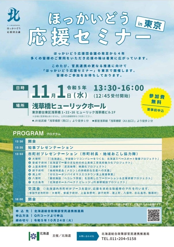 北海道では、地域の支援ニーズと企業等の応援ニーズのマッチングを通じて、多様化・複雑化する地域課題を解決するため、様々な取組を展開しているところですが、このたび、道外企業等と道内市町村におけるマッチング機会の創出のため、知事や市町村長が本道の魅力や応援を求める具体的な取組をPRする場として、「ほっかいどう応援セミナー」を11月1日(水)に開催します(要事前申込・参加無料)。