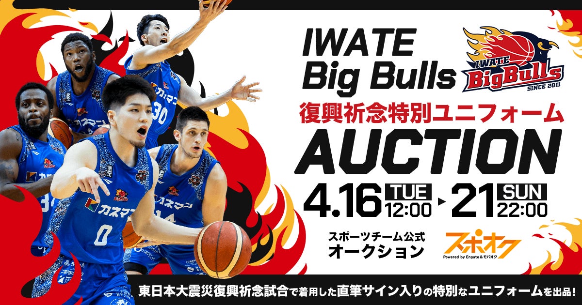 株式会社モバオク(本社:東京都渋谷区、代表取締役社長:生田目 知之、以下モバオク)とエンゲート株式会社(本社:東京都中央区、代表取締役:城⼾ 幸⼀郎、以下エンゲート)が業務提携し提供するスポーツチーム公式オークションサービス「スポオク」は、B.LEAGUE所属の岩手ビッグブルズを運営する株式会社岩手ビッグブルズ(以下、岩手ビッグブルズ)が実施する「岩手ビッグブルズ【復興祈念特別ユニフォーム】オークション」を2024年4月16日(火)から開始します。