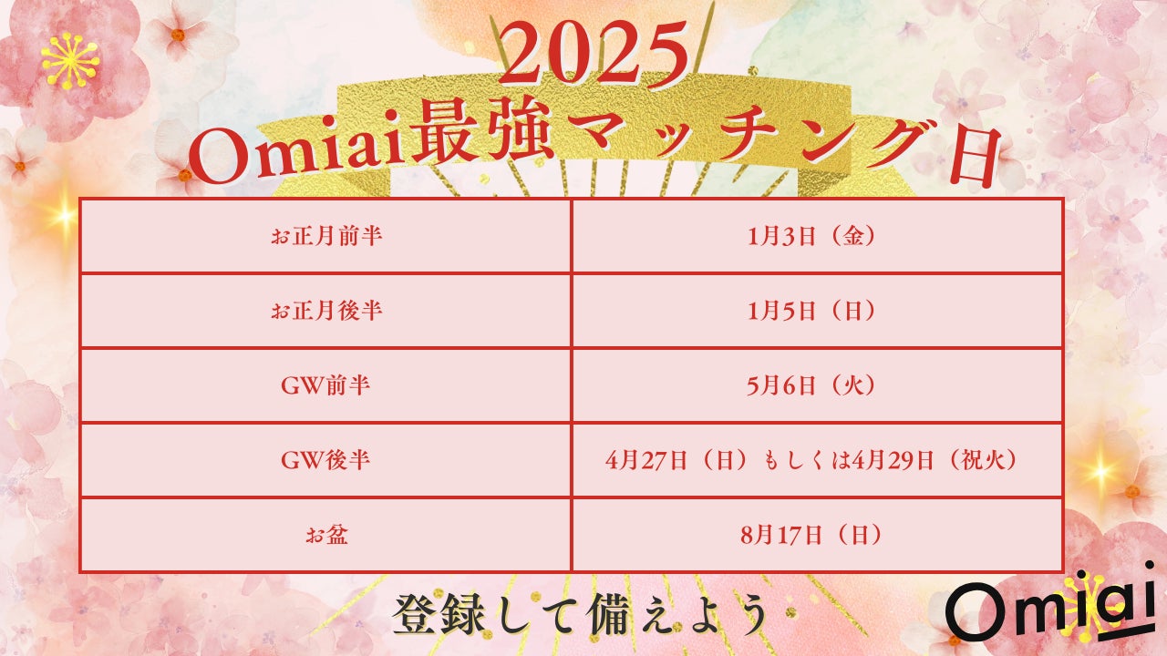 さらに、2025年もたくさんのいい出会いのきっかけを提供すべく、『Omiai』の過去のデータを分析し、2025年の日にちの中から、マッチング率が高いと予想される日程をランキングで発表。その中でもマッチング率が高まりそうな日程も予測!