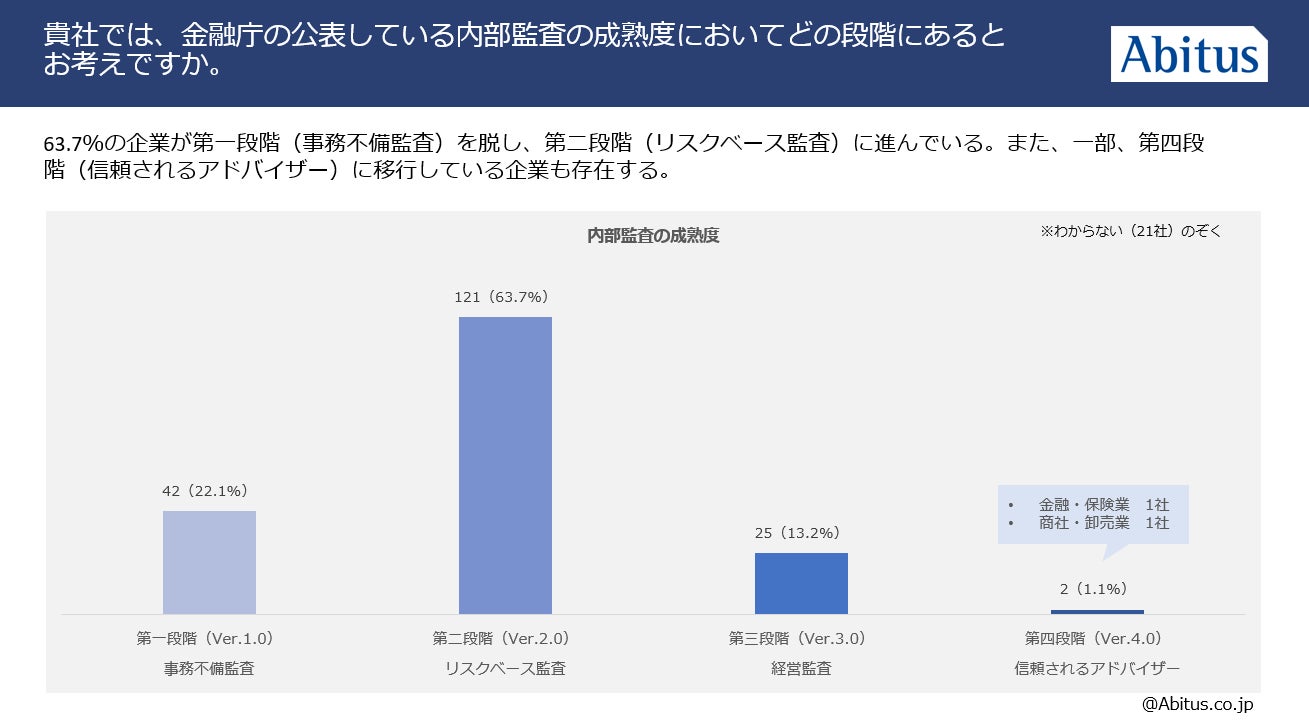 ・内部監査の成熟度は、第二段階が63.7%、第三段階が13.2%と回答。さらに、第四段階へ移行していると回答した企業も出現している