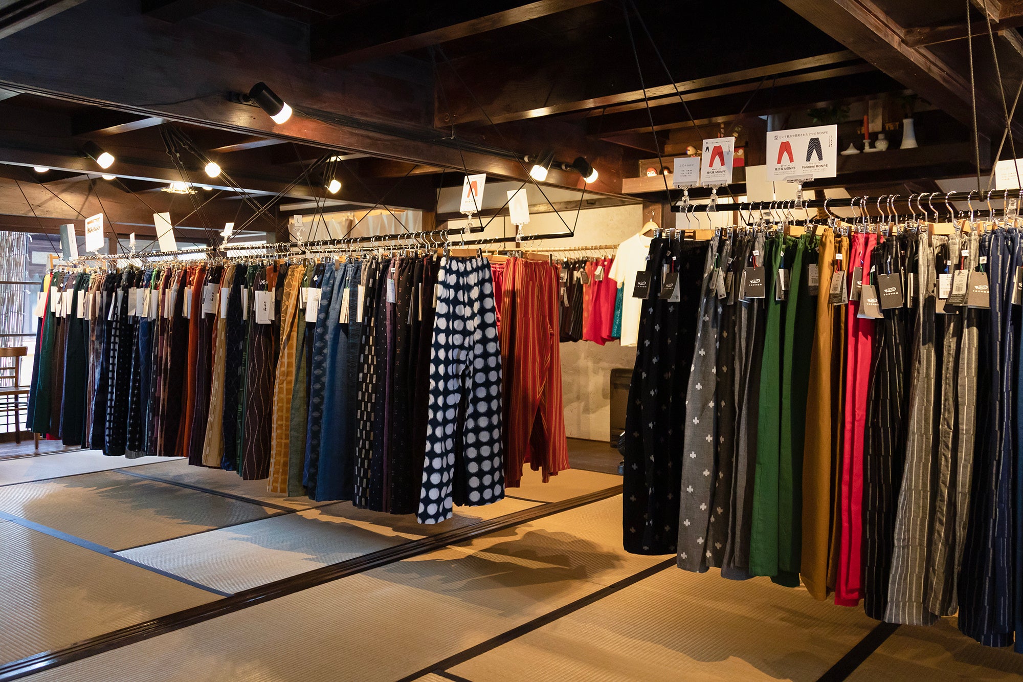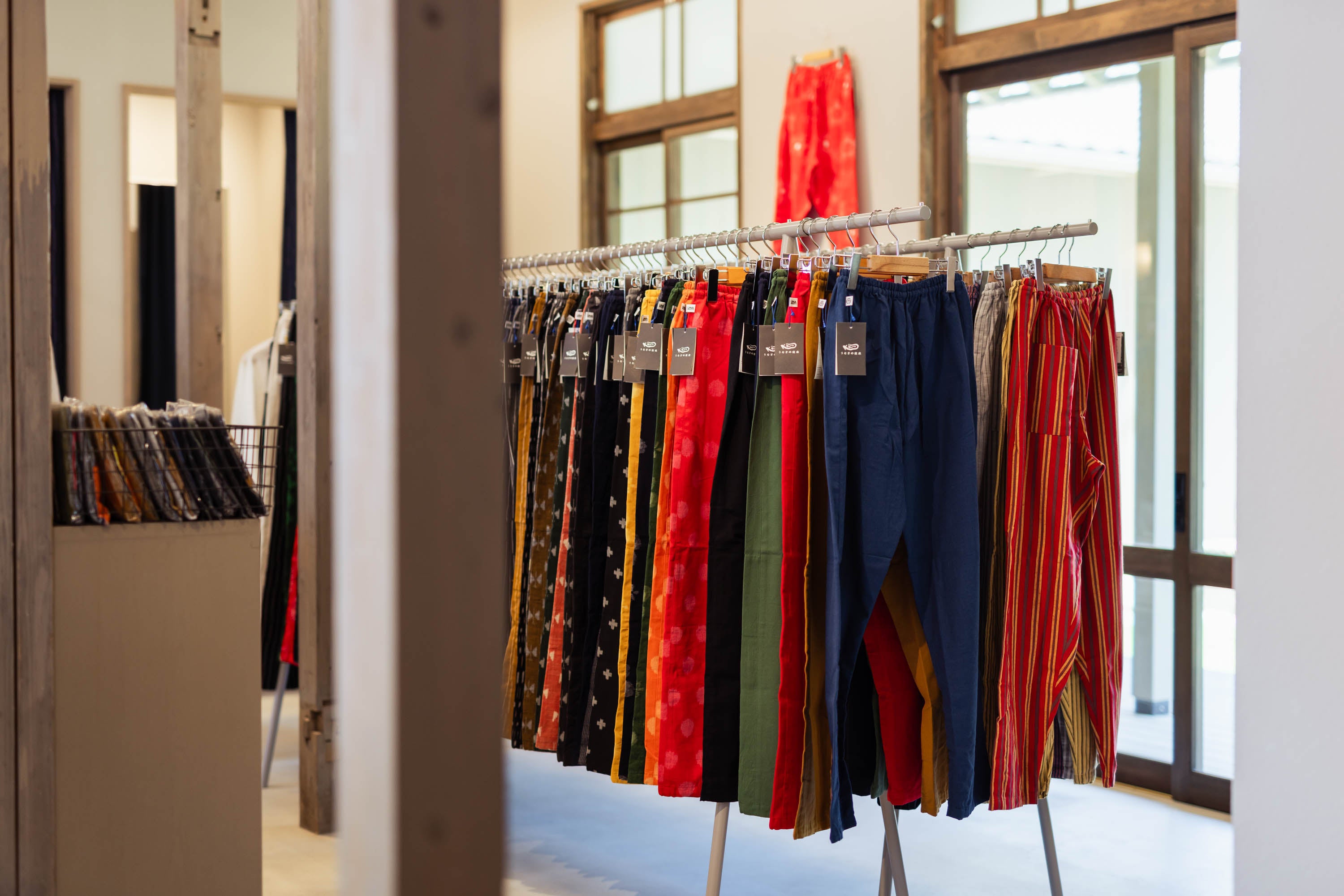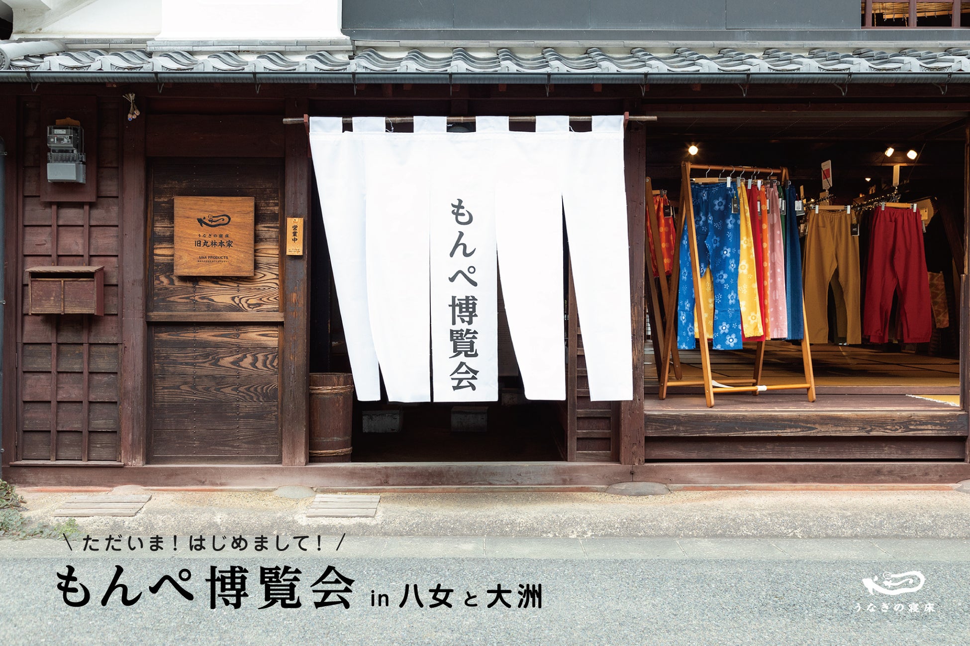 「うなぎの寝床 アクロス福岡店」での開催に続き、今回は八女「旧丸林本家」、そして新店舗の「愛媛大洲店」で開催。ただいま八女!はじめまして大洲!それぞれの店舗にずらりと並ぶもんぺの数々をお楽しみください