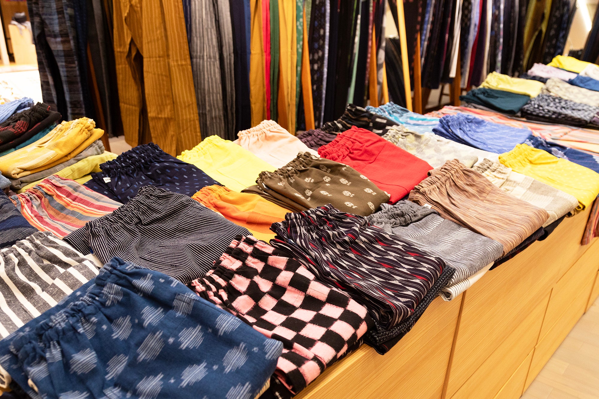 ※アクロス福岡店に出展いただいた4織元のもんぺがずらりと並びます。