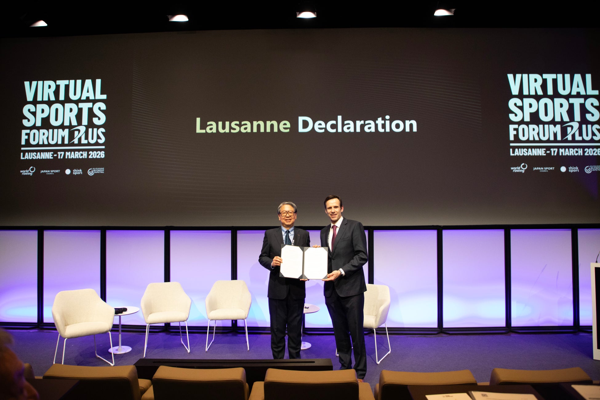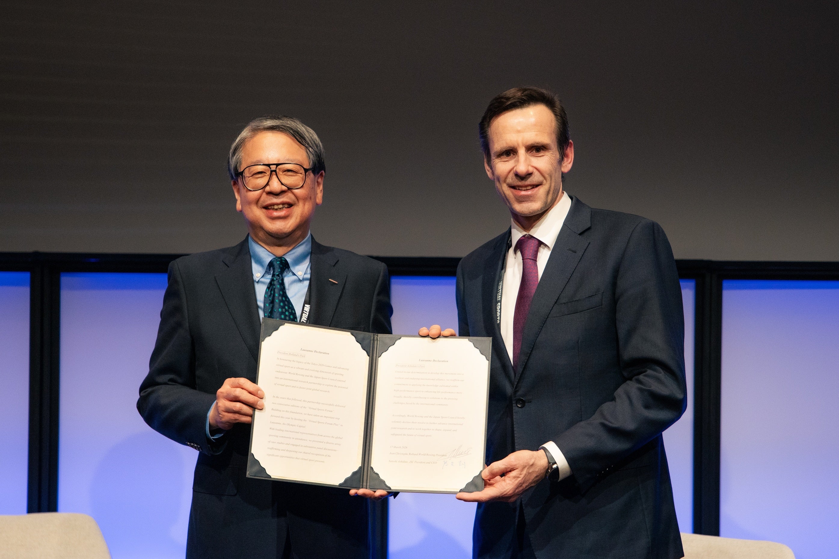 ジャン=クリストフ・ロラン氏(ワールドローイング会長)、芦立訓(JSC理事長)が、バーチャルスポーツの発展に向けた持続可能かつ国際調和的な行動を掲げる「ローザンヌ宣言」を発表しました。本宣言は、ワールドローイングおよびJSCが、バーチャルスポーツの未来を形づくり、その発展を促進するとともに、その健全性を守っていくことへの強いコミットメントを示すものです。