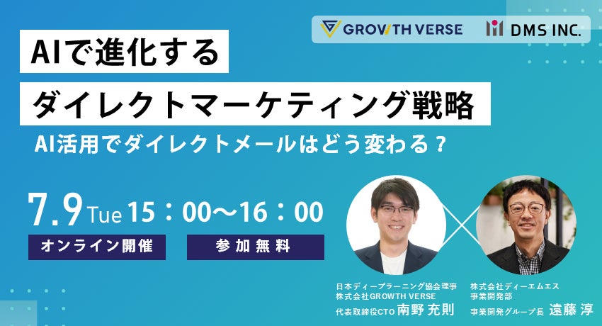 株式会社GROWTH VERSE(本社:東京都豊島区、代表取締役CEO:渡部 知博、代表取締役CTO:南野 充則)は、ダイレクトメールのリーディングカンパニーである株式会社ディーエムエス(本社:東京都千代田区、代表取締役社長:山本 克彦)と共催で、「AIで進化するダイレクトマーケティング戦略~AI活用でダイレクトメールはどう変わる?~」と題したセミナーをオンライン配信にて開催します。