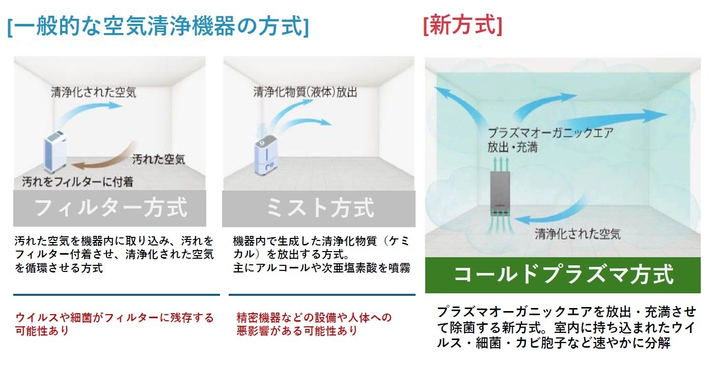 一般的なコールドプラズマは、細長い電極間や針形状電極の先端などで生成される方法が主流で、ラジカル基の生成効率の改善が課題となっていました。一方「コールドプラズマ技術」は、コールドプラズマ発生電極の形状が「面」で構成されており、かつこの電極を「積層化」することで、少ないエネルギーでより多くのプラズマ領域を発生させることができるため、生成されるラジカル基の発生効率を最大化できる仕組みです。この技術で有効成分を空間に放出・充満させることで、従来よりも効率的な空間除菌が可能です。