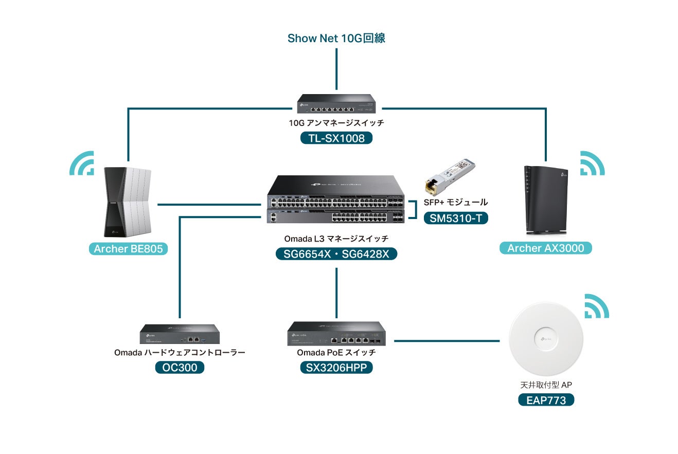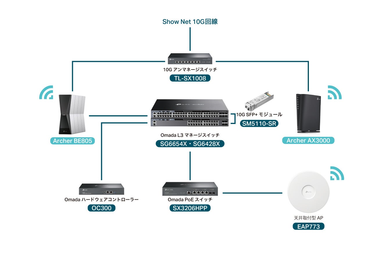 ブース内では、L3マネージスイッチ「SG6654X」「SG6428X」とWi-Fi 7アクセスポイント「EAP773」を活用した10G×Wi-Fi 7環境を構築します。家庭用Wi-Fi 7ルーター「Archer BE805」も接続予定です。
