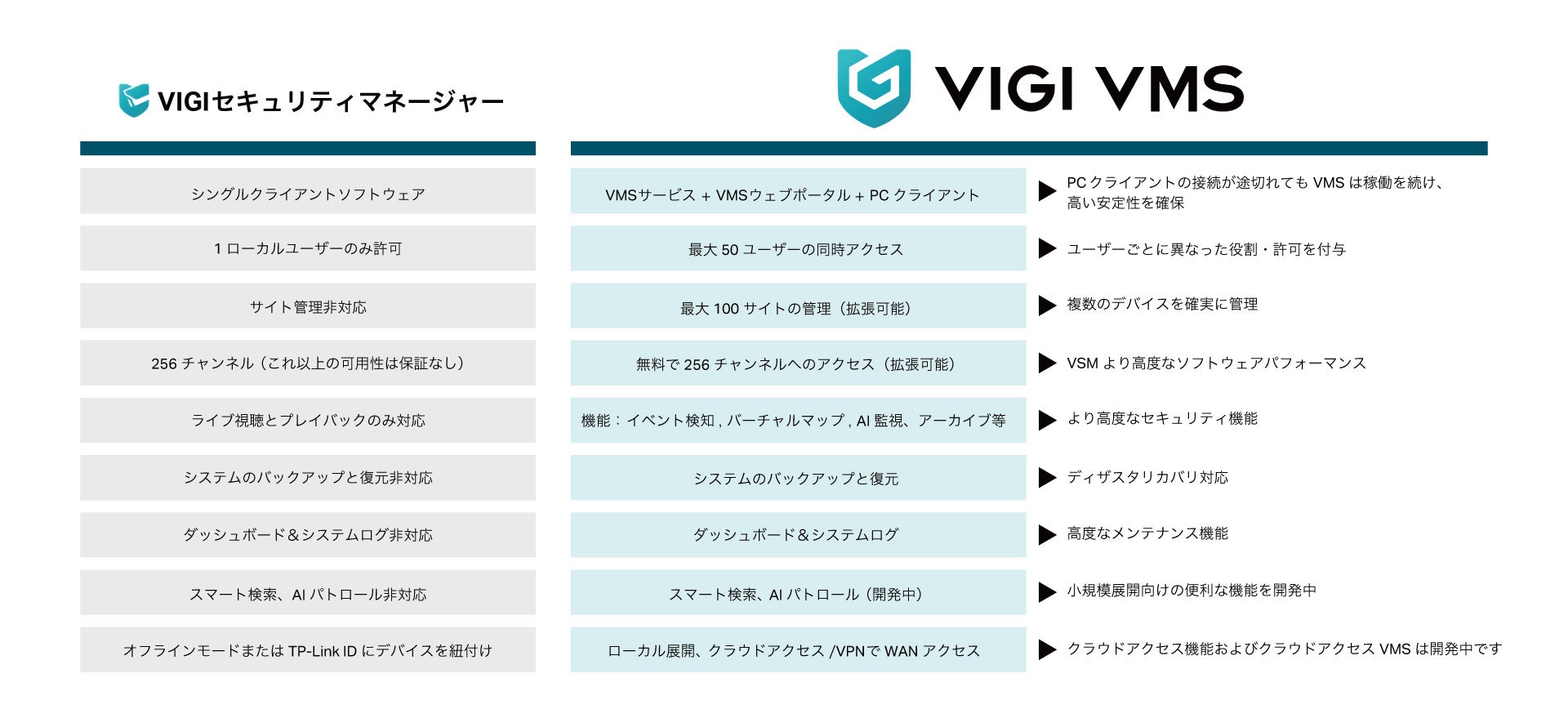 大規模監視に対応するクラウド管理システム「VIGI Cloud VMS」を初公開予定です。従来のソフトウェアシステム「セキュリティマネージャー」と比べて機能と利用規模を大幅に拡張しました。ライセンス費用はそのまま無償でご利用いただけます。