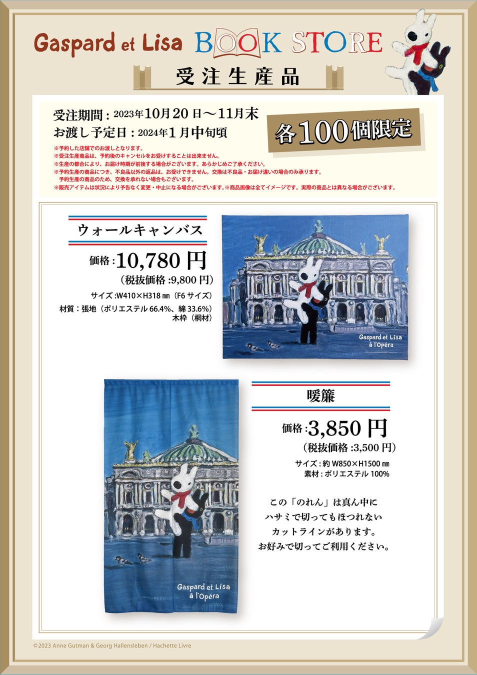 ⼀部書店では、書店限定グッズの発売を記念してPOP UP STOREを開催いたします。書店限定グッズだけでなく、バラエティに富んだ「リサとガスパール」グッズを取り揃えた期間限定ショップです。さらにPOP UP STOREでは、受注生産商品のウォールキャンバスと暖簾のご予約を受け付けております。いずれも100個限定でのご用意となりますので、ぜひこの機会にPOP UP STORE開催店舗にお越しください。