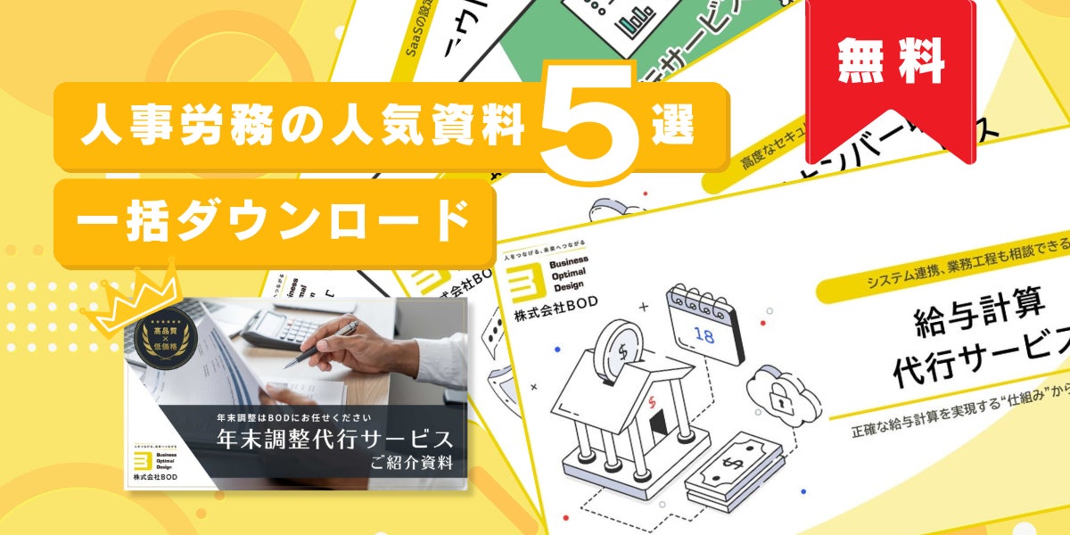 人×テクノロジーで社会の原動力となり「人をつなげる 未来へつながる」の実現を目指す株式会社BOD(本社:東京都豊島区、代表取締役:田中大善、以下BOD)は、4月8日に「人事労務の人気資料5選」を公開しました。これまでたくさんの方にご活用いただいた、年末調整代行/給与計算代行/マイナンバー収集・管理代行/住民税年度更新代行/クラウドシステム導入支援について、わかりやすく説明しています。