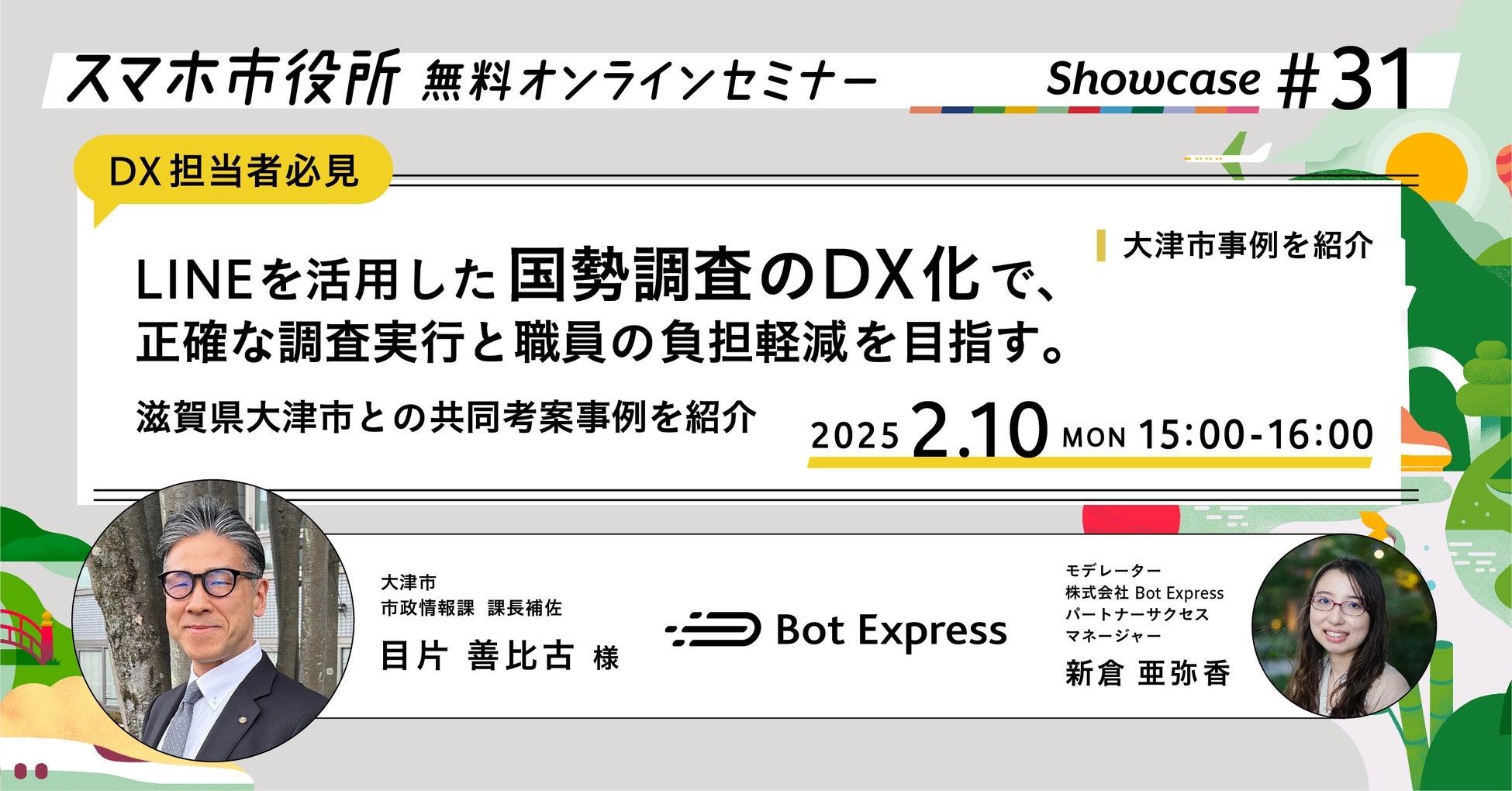 株式会社Bot Express(本社:東京都港区、代表取締役:中嶋 一樹、以下 Bot Express)は、スマホ市役所を実現している官公庁・地方自治体の事例を共有する無料オンラインセミナー「Bot Express Showcase」を毎月開催しています。2月10日(月)の開催が決定しましたのでお知らせいたします。