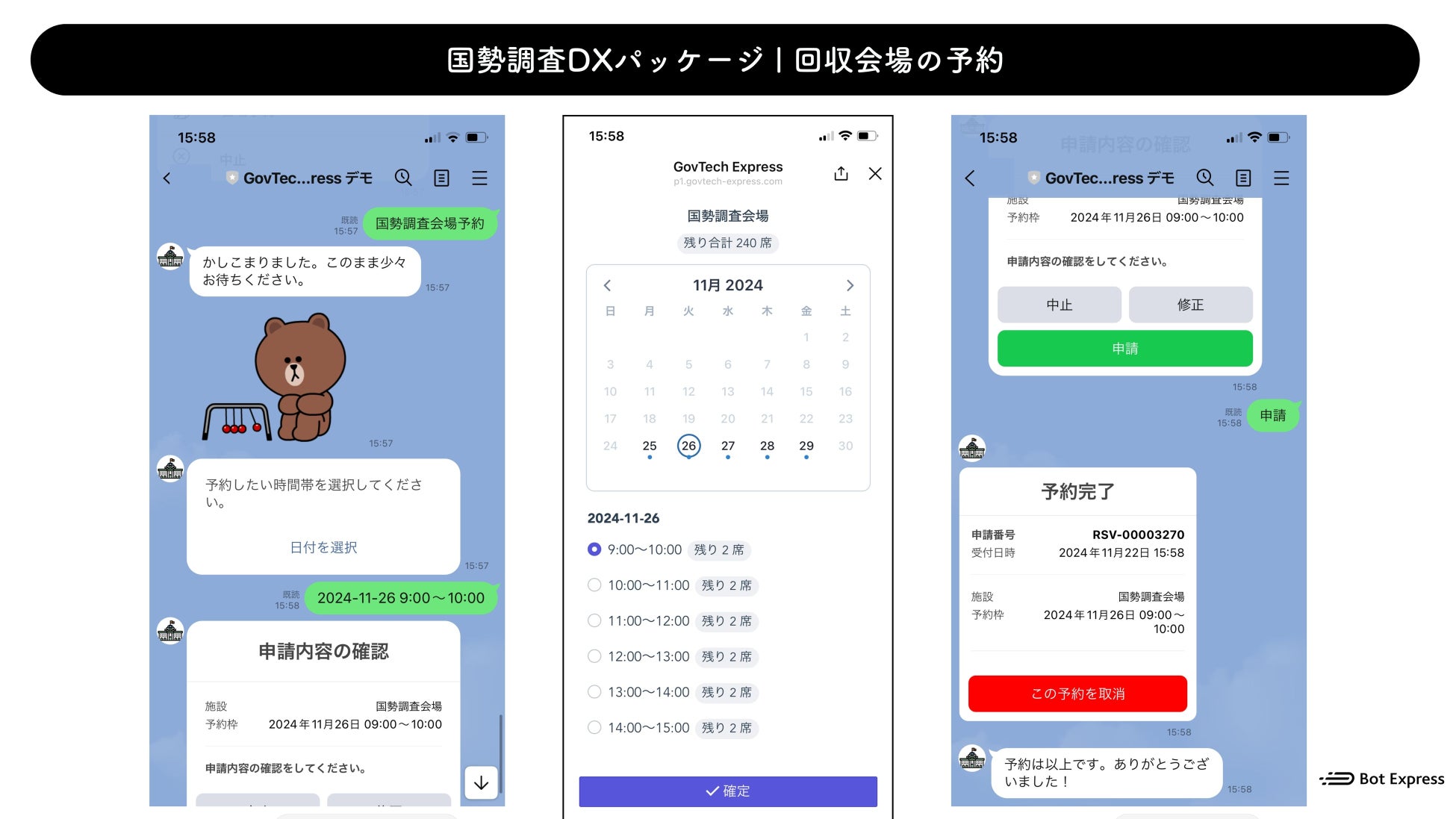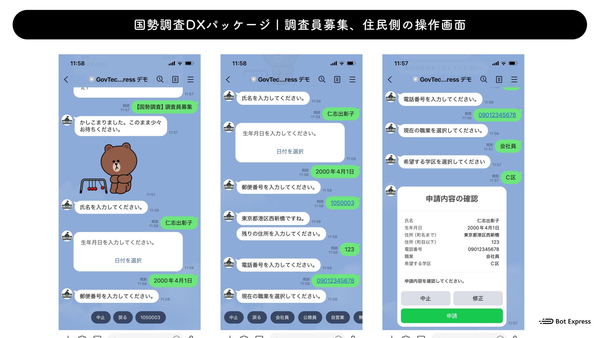 大津市は、大津市LINE公式アカウントとBot Expressが開発提供する「GovTech Express」を連携し、LINE上で、調査員の募集や、指導員や調査員との連絡、調査票回収会場の予約、報酬明細の配布、よくある質問へのチャットボット回答などができる「国勢調査DXパッケージ」を考案しました。