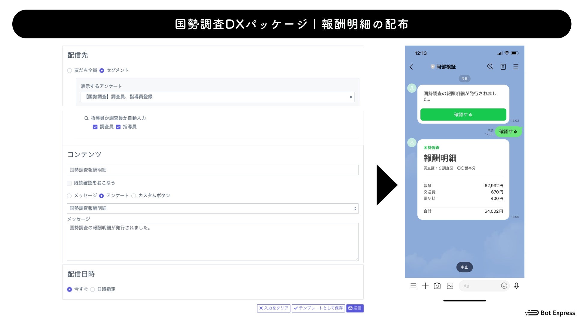 郵便料金が値上がりした昨今、郵送物をデジタル送付する動きも。調査員への報酬明細をLINEで配布することが可能。