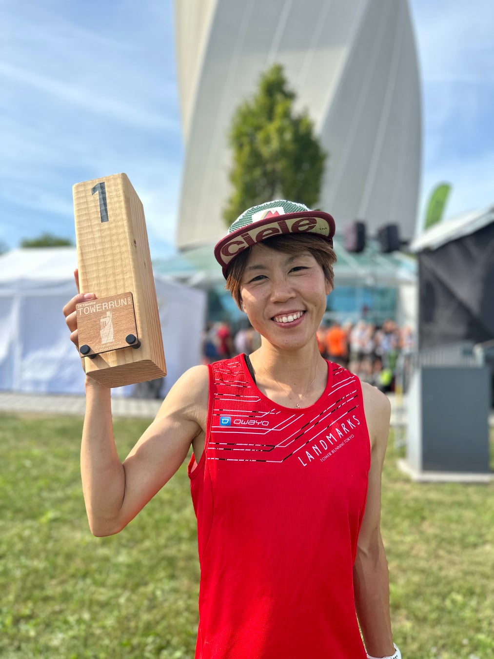 1986年千葉県出身。学生時代は陸上競技に打ち込み、26歳の時に仕事の傍ら競技生活をスタートさせると、2017年に初めて参加した「あべのハルカススカイラン」で優勝。翌年から本格的に階段競技を開始し、世界トップレベルの成績を残す。その一方でLEOCの厨房事業所に2020年から勤務し、調理業務を担当。一児の母として世界一を目指す「ママアスリート」でもある。