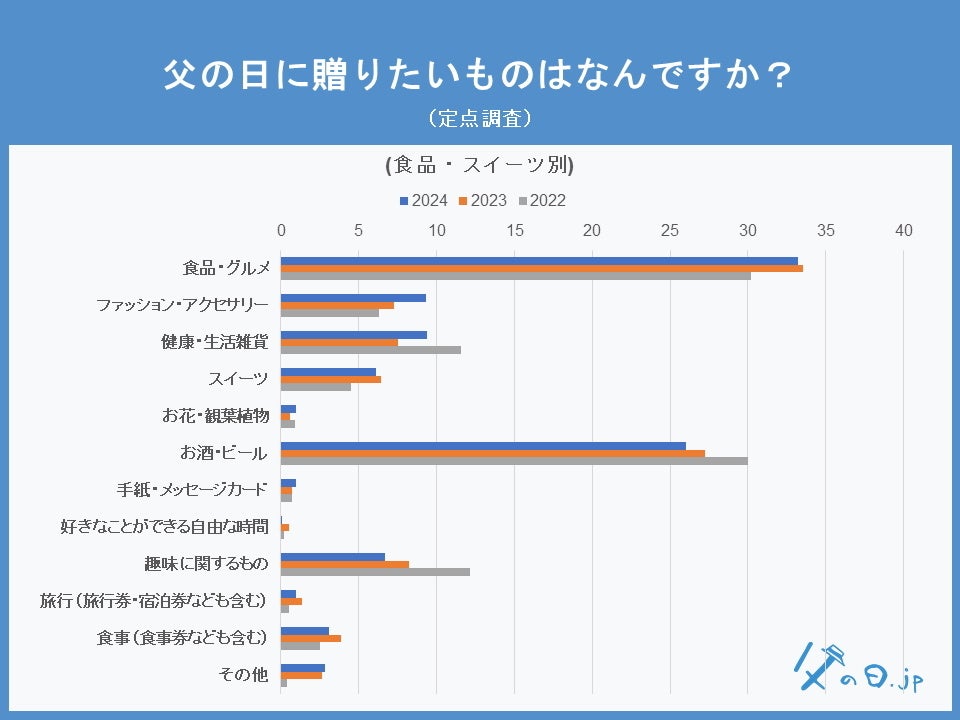 3年間の定点調査によると、2023年、2024年と父の日ギフトの定番である「お酒・ビール」は減少傾向にあります。
