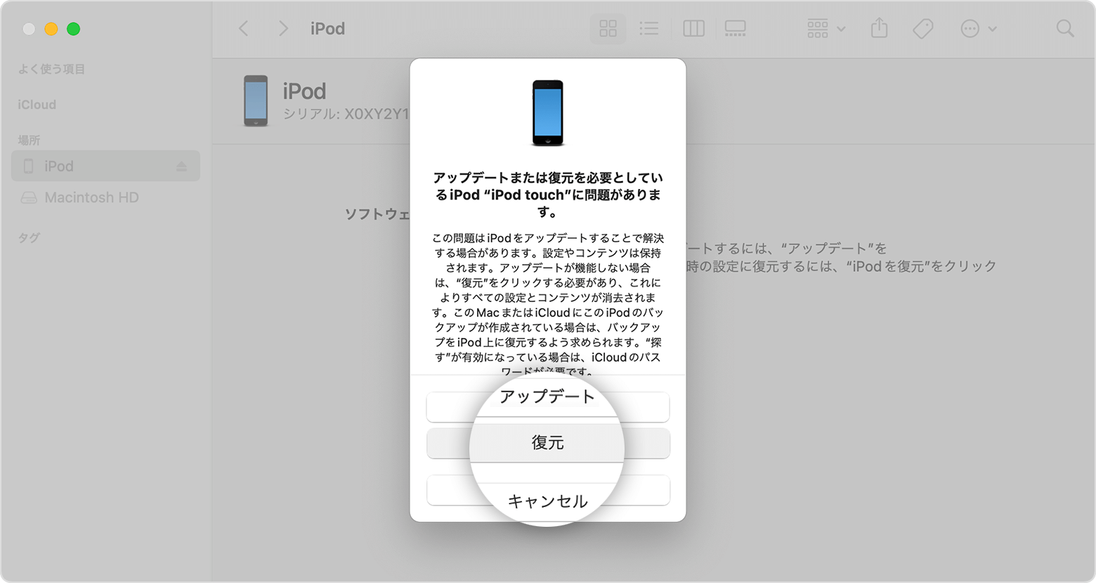 Step3:iTunes画面にメッセージが表示されるので「復元」をクリックします。