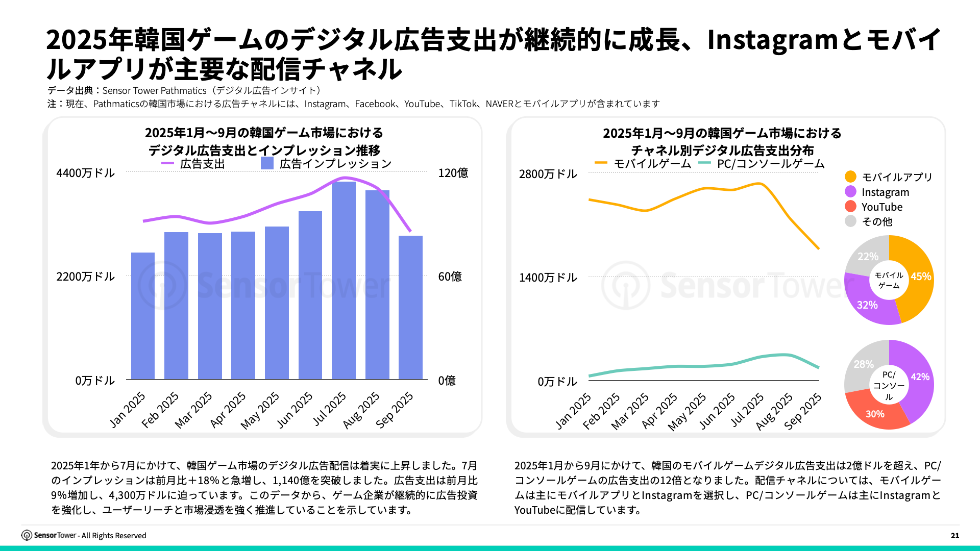 2025年1月から9月にかけて、韓国のモバイルゲームデジタル広告支出は2億ドルを超え、PC/コンソールゲームの広告支出の12倍となっりました。配信チャネルについては、モバイルゲームは主にモバイルアプリとInstagramを選択し、PC/コンソールゲームは主にInstagramとYouTubeに配信しています。