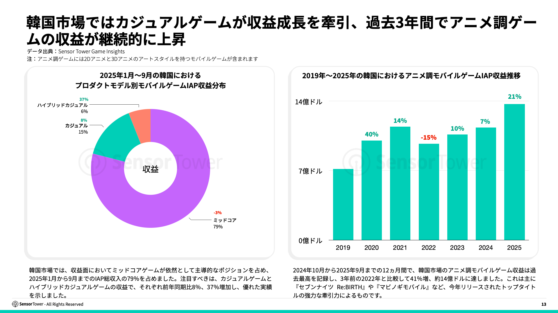 2024年10月から2025年9月までの12ヵ月間で、韓国市場のアニメ調モバイルゲーム収益は過去最高を記録し、2022年比で41%増加して約14億ドルに達しています。これは主に『セブンナイツ Re:BIRTH』や『マビノギモバイル』など、今年リリースされたトップタイトルの強力な牽引力によるものです。