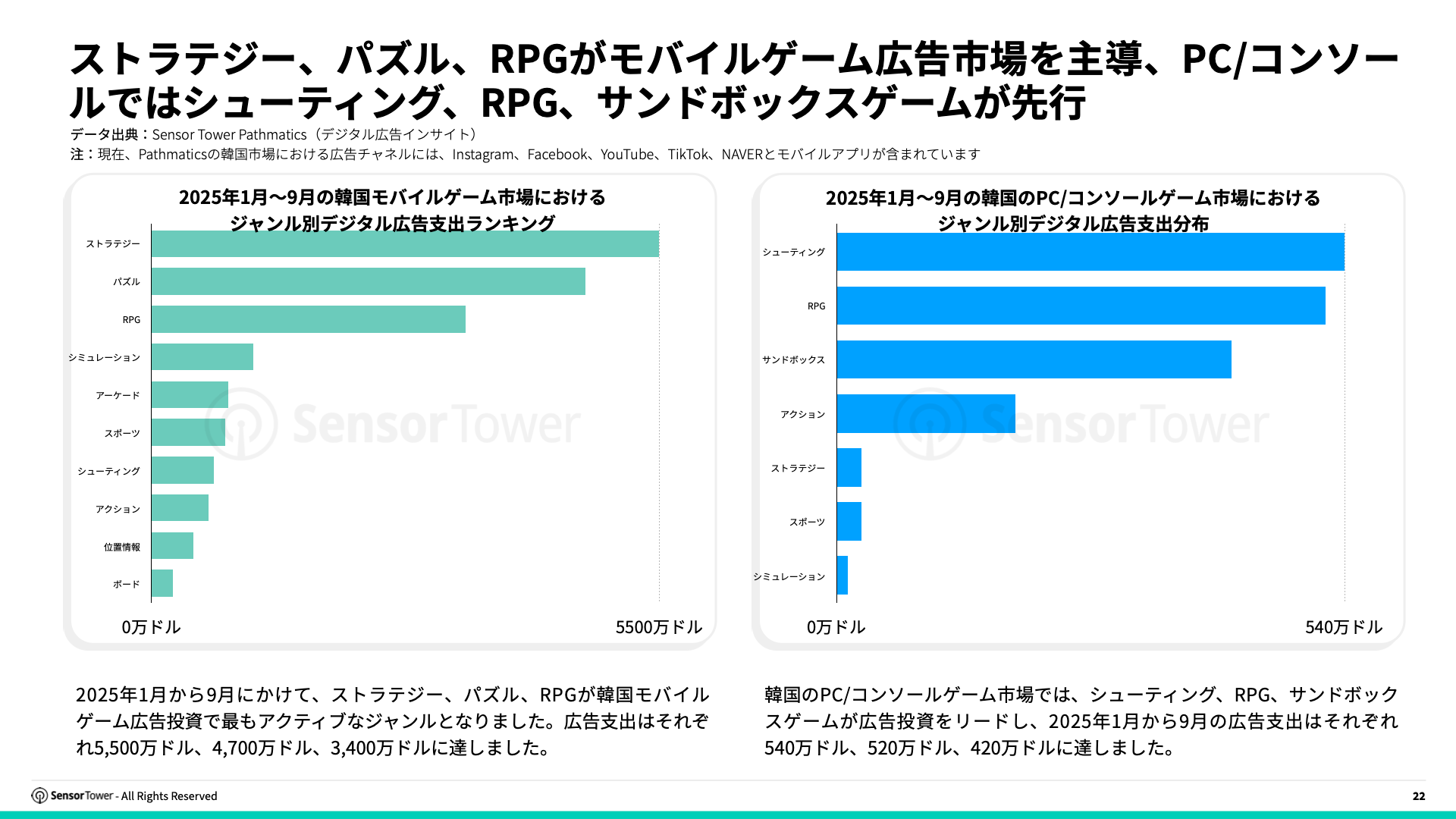 2025年1月から9月にかけて、ストラテジー、パズル、RPGが韓国モバイルゲーム広告投資で最もアクティブなジャンルとなりました。広告支出はそれぞれ5,500万ドル、4,700万ドル、3,400万ドルに達しました。一方、PC/コンソールゲーム市場では、シューティング、RPG、サンドボックスゲームが広告支出をリードし、当期の広告支出はそれぞれ540万ドル、520万ドル、420万ドルに達しました。
