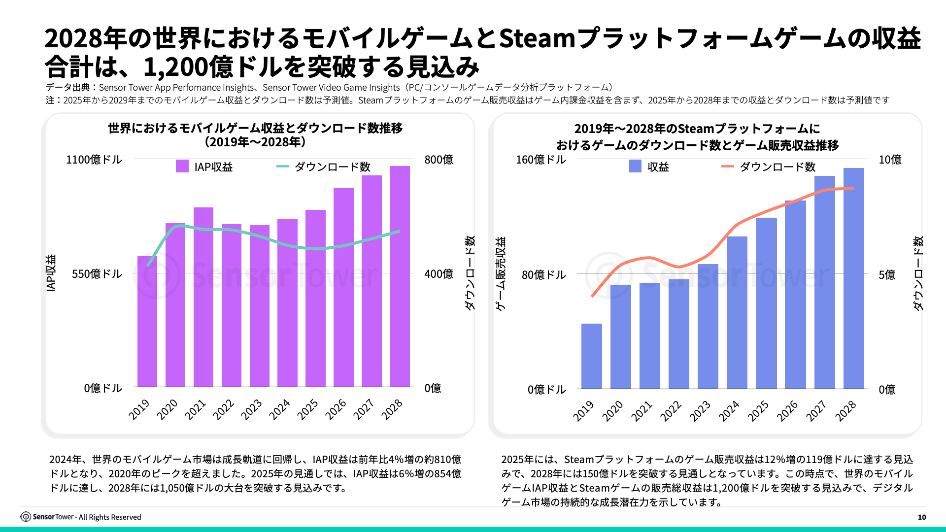 世界のモバイルおよびPC/コンソールゲーム市場の収益は着実に増加しており、2025年のモバイルゲームIAP収益は6%増の854億ドル、Steamプラットフォームのゲーム販売収入は12%増の119億ドルに達すると予測されています。2028年には、モバイルゲームIAP収入とSteamゲーム販売収入がそれぞれ1,050億ドルと150億ドルを超え、両者の合計収益は1,200億ドルを突破する見込みです。
