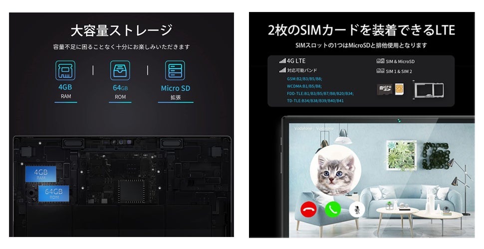 👍I10 Pro Androidタブレットは4GBのRAM(メモリ)と64GBのROM(高速ストレージ)を搭載し、MicroSDカードで最大512GBのストレージに拡張することができます。メモリ容量が大きいとタブレットはサクサク動くようにな