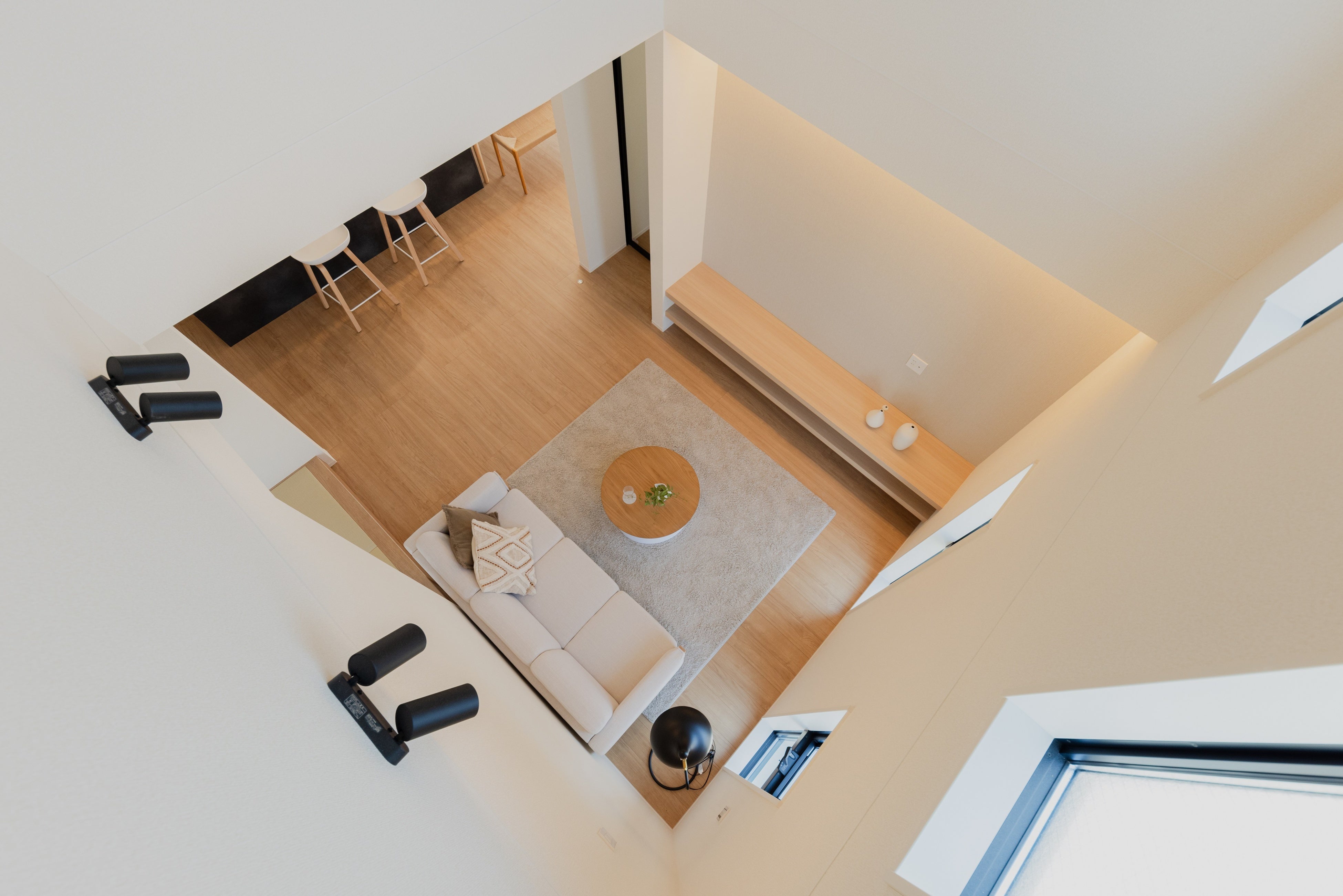 今回、公開した名古屋市港区のモデルハウスでは、空間を広くみせるガラス製の扉や人気の幅広タイプの洗面、高級感のあるアイランドキッチンが特徴的です。開放感のある吹き抜け部分には、ホスクリーンが設置されており、天気に左右されずにお洗濯が出来るので、共働き夫婦にも喜ばれそうです。また、お客様が実際に生活するイメージを持っていただけるように、LDKに家具を設置しております。