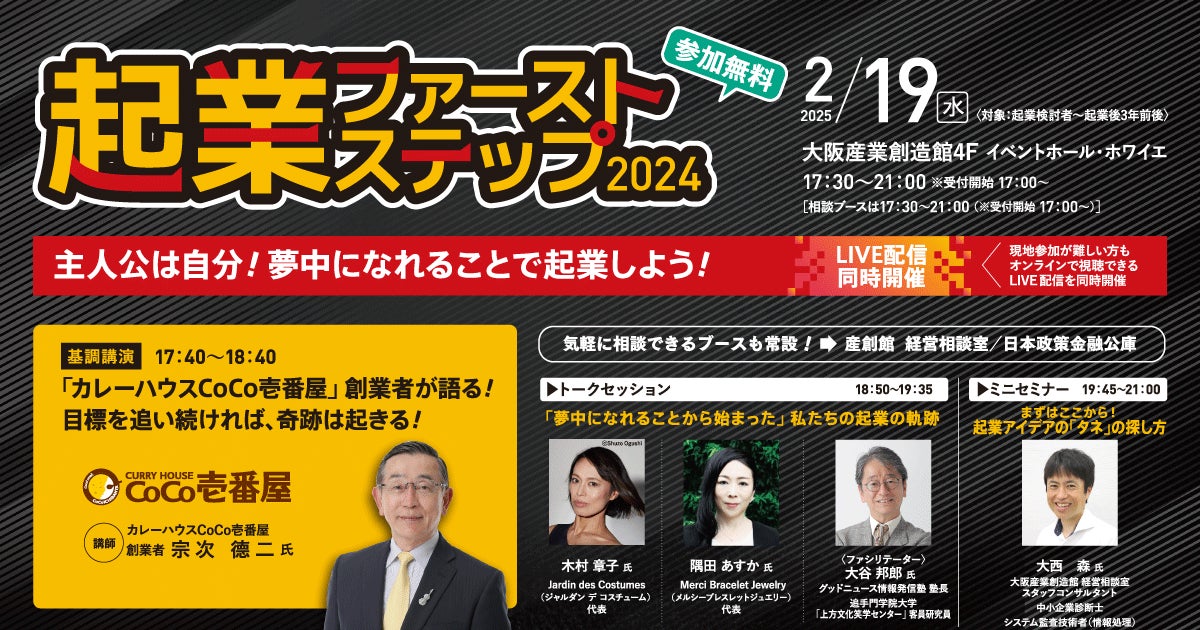 起業に興味がある方を応援する「起業ファーストステップ2024」を2025年2月19日(水)に大阪市の中小企業支援拠点「大阪産業創造館」にて開催します。「起業に興味があるが、何から始めればいいのかわからない」「起業に向けて情報を集めたい」という方にぴったりのイベントです。