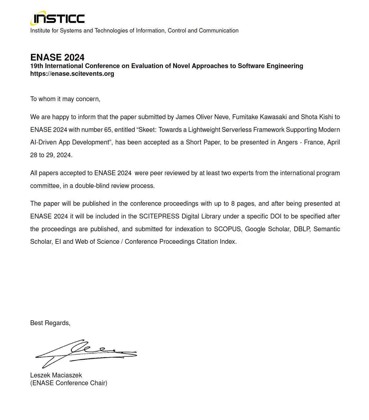 この度、エルソウルラボの Skeet 開発チーム(ジェームス ニーヴ、川崎 文武、岸 正太)による研究論文「Skeet: Towards a Lightweight Serverless Framework Supporting Modern AI-Driven App Development」について、ENASE 2024 に採択されました。