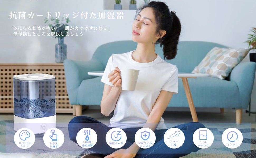【アロマ対応&8色ナイトライト】耐食性と安全性の高いABS+AB材料で作られた水タンクに、お好きなエッセンシャルオイルを入れると、アロマディフューザーとして、空気清浄、加湿しつつも、香りによる心地よさを得られます。おしゃれのライトは8色循環モードと単色固定モードを搭載しています。幻想的な空間でリラックスしてください。【1年間の安心対応】日本のPSE規格に適合しており安心してご使用いただけます。 ご購入後30日間は商品に不具合がございます場合は新品交換させていただきます。不明な点がございましたら、アマゾンの購入履歴より弊社までご連絡ください。
