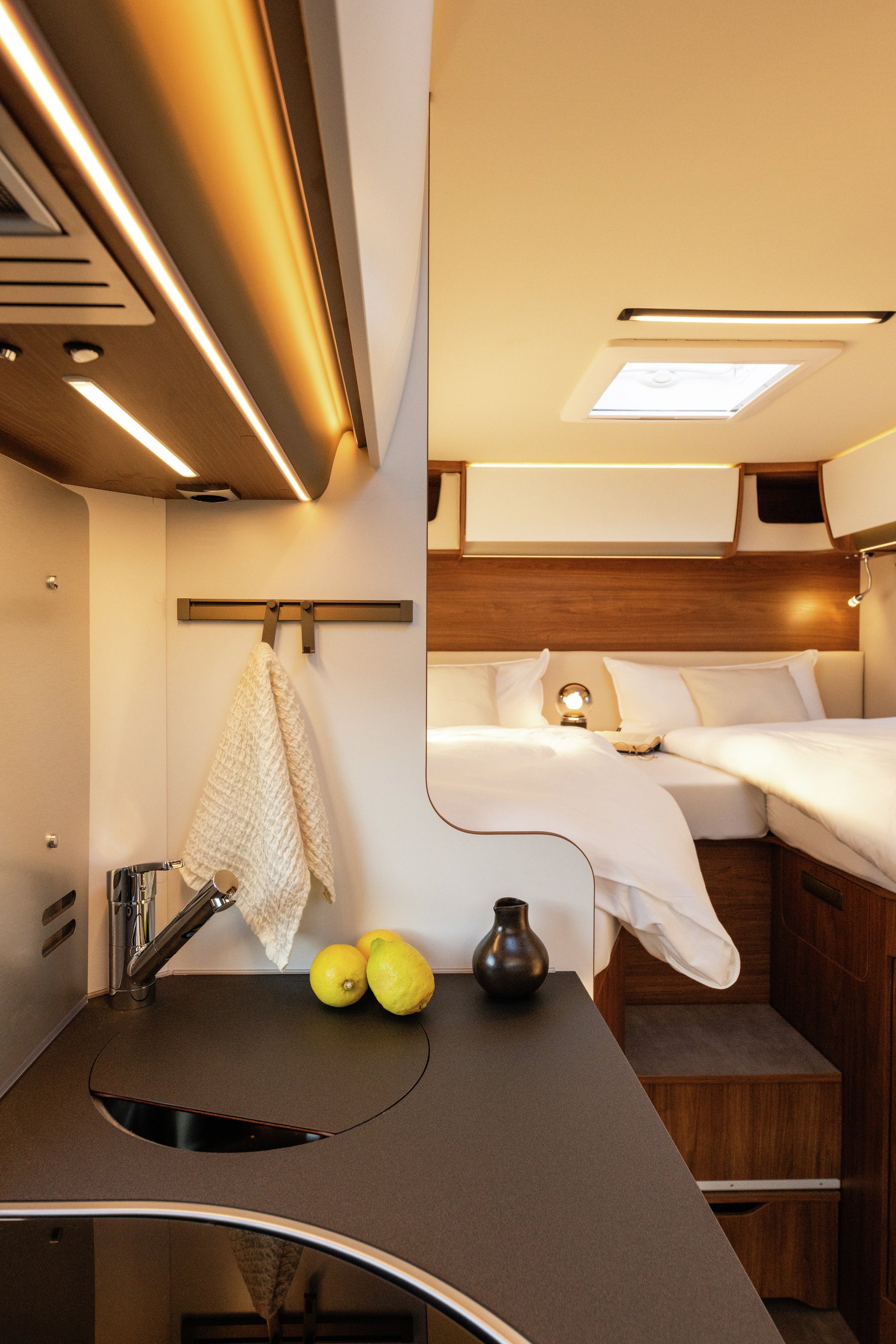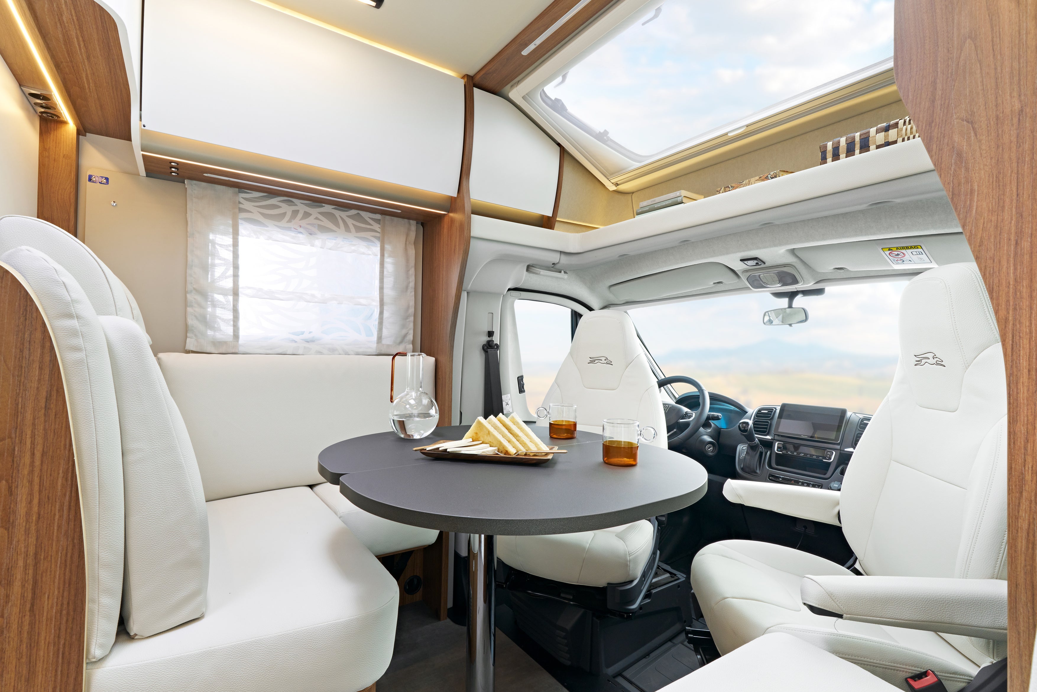 限られた車内空間の中で機能的にレイアウトされた室内は無駄がなく快適。ご夫婦でのゆったりとした旅から、ペットとの旅行、時にはゲストを迎えて過ごすひとときまで、幅広いライフスタイルに寄り添う一台です。