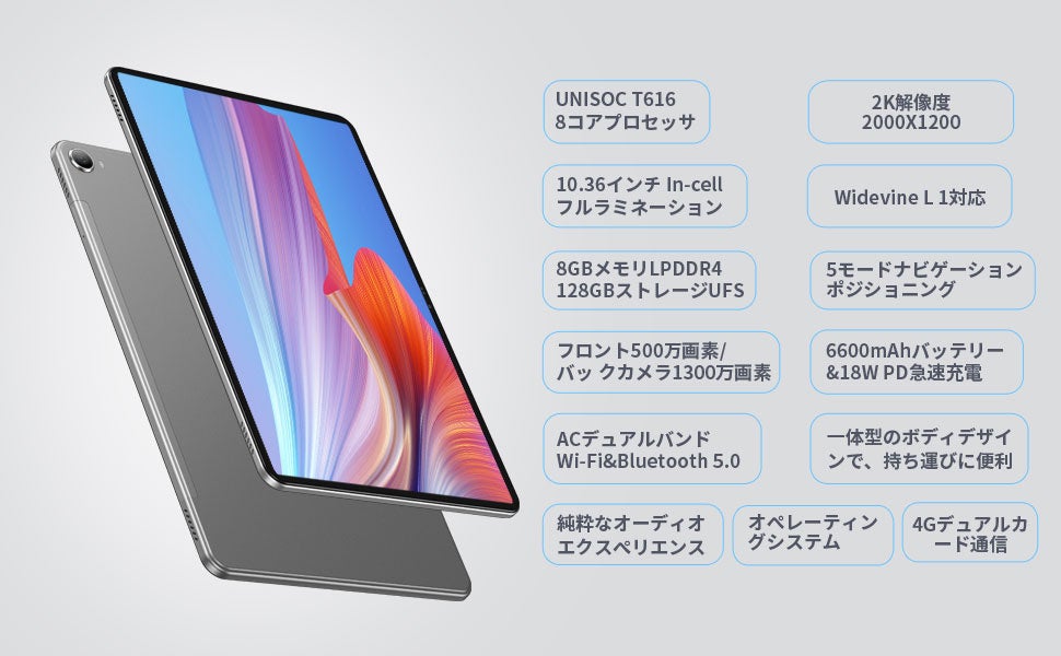 【10.4インチ高解像度2000*1200 Incell FHD IPS ディスプレイ】このタブレットの大型のIPSディスプレイは、10.4インチの大きな画面サイズにより、映像を快適に楽しむことができます。また、高解像度のFHD画面により、映像が鮮明で美しく、色彩表現も豊かです。IPSパネルを採用することにより、広い視野角からでも映像を見ることができ、グラフィックが美しく、テキストが鮮明に表示されます。