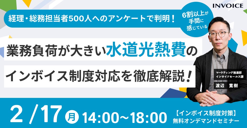 16,000社に対して経理BPOサービスを提供している、株式会社インボイス(代表取締役:加茂 正巳 本社:東京都千代田区)は、2025年2月17日(月)に、経理・総務500人へのアンケートから判明した業務負荷が大きい水道光熱費のインボイス制度対応を徹底解説したオンデマンドセミナーを配信致しますので、お知らせいたします。