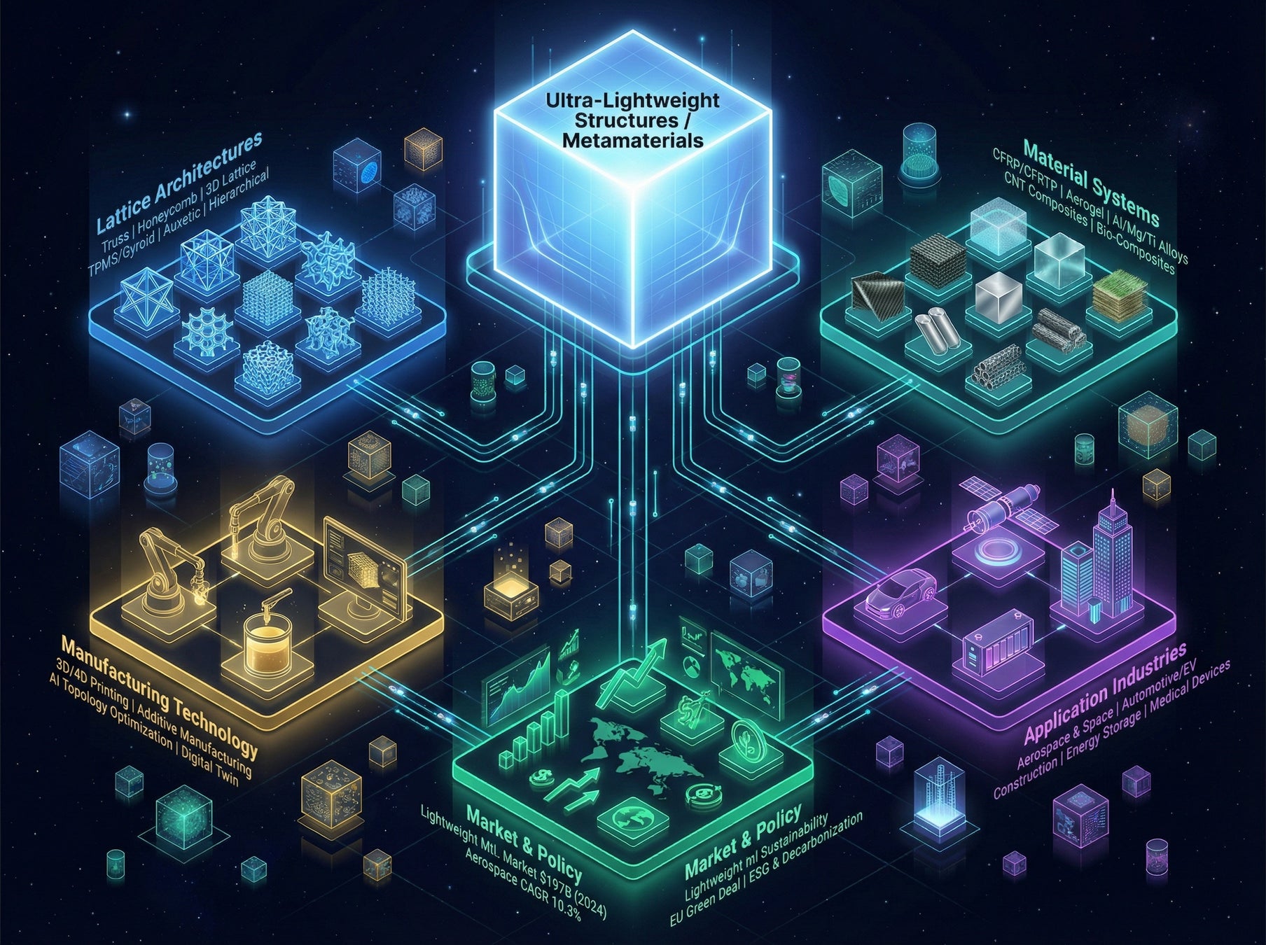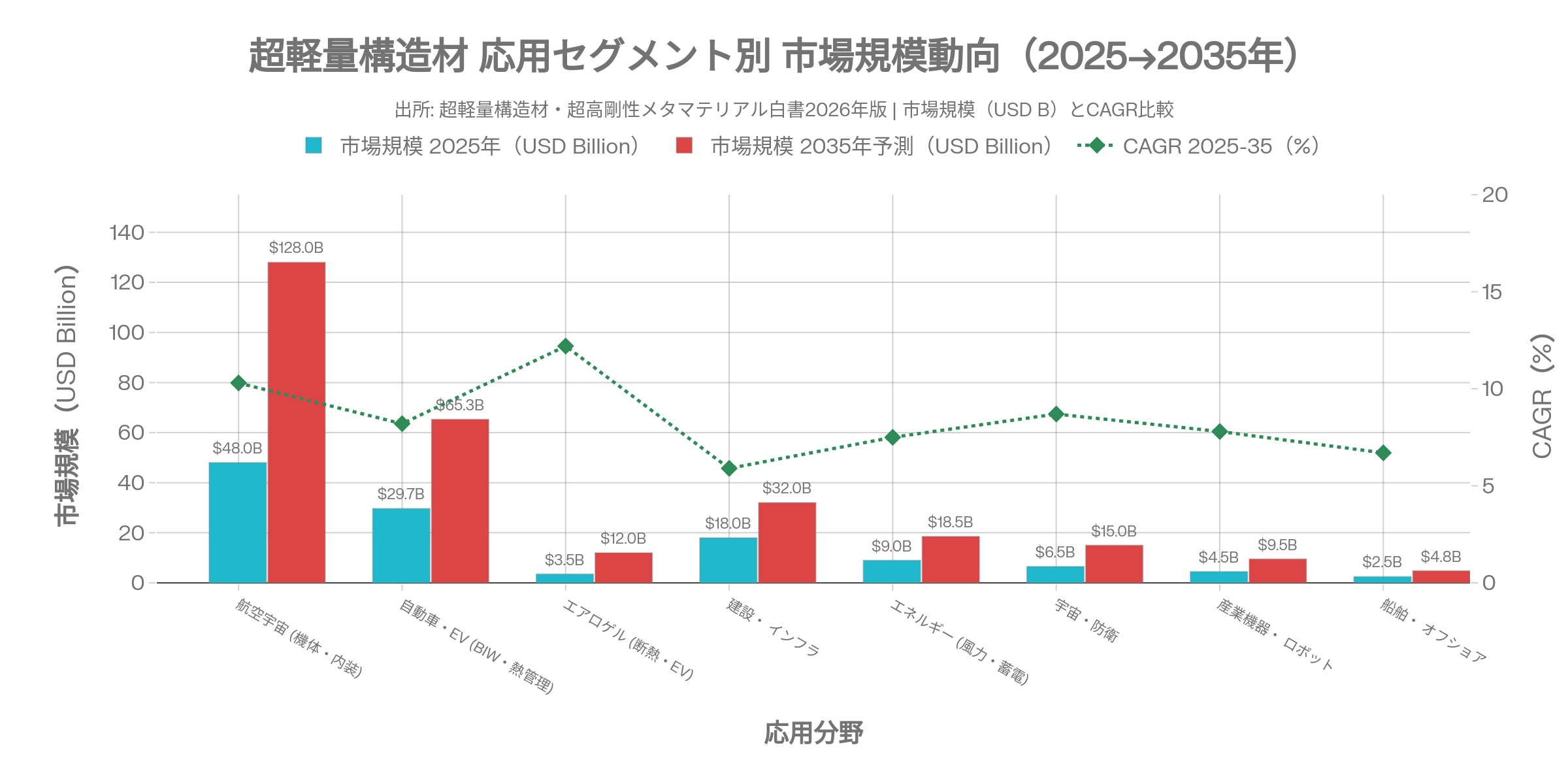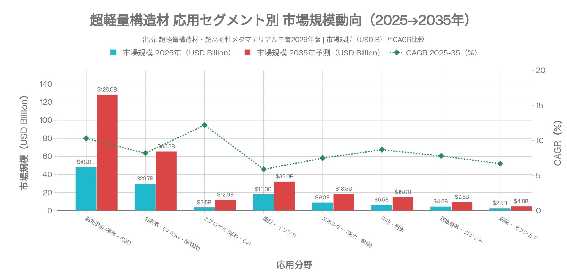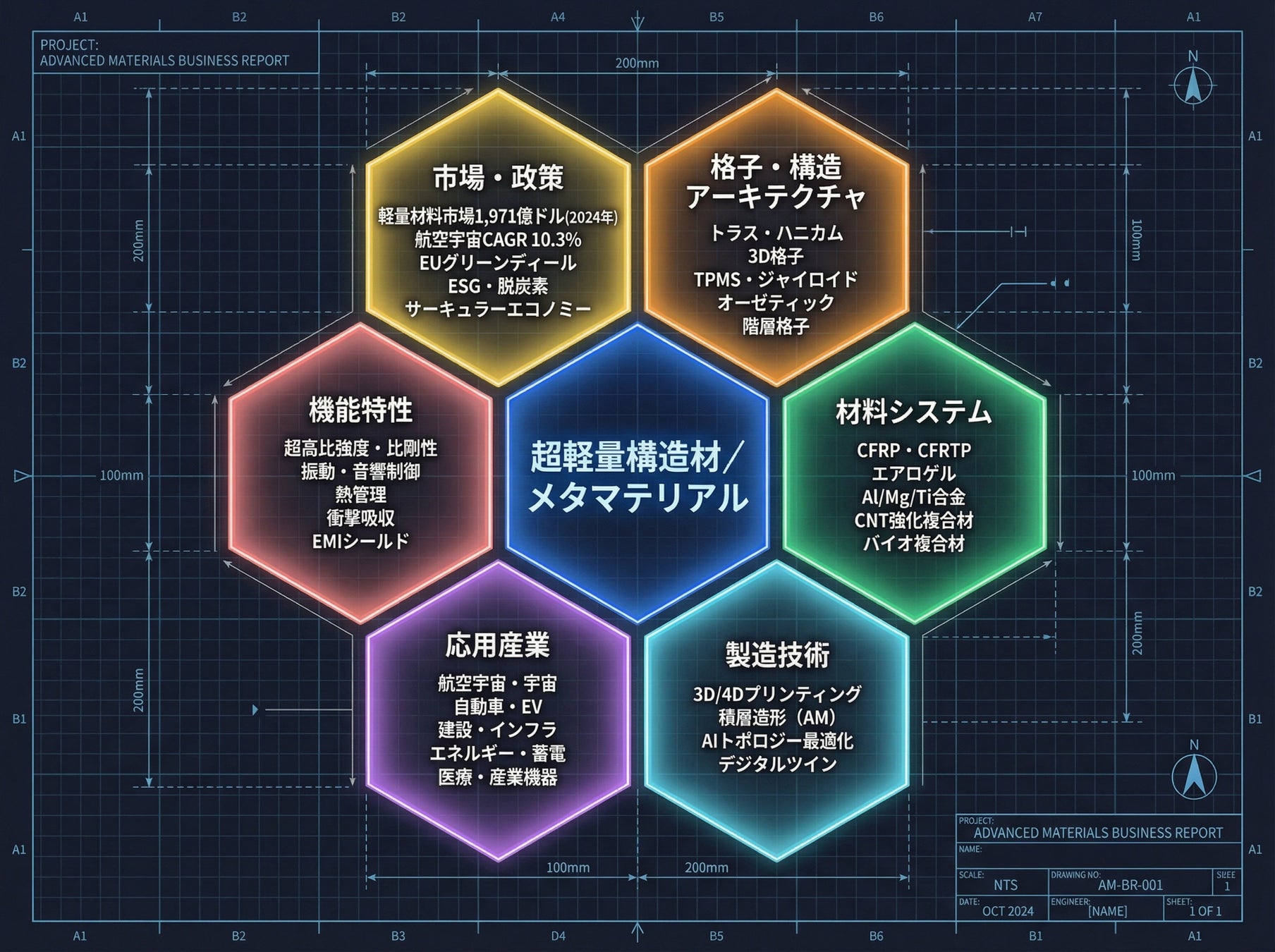 炭素繊維複合材・エアロゲル・Al/Mg/Ti軽量合金・格子構造材・メタマテリアルを中核として、航空宇宙・自動車EV・建設・エネルギー・宇宙・医療・産業機器という七大産業領域を横断的に分析