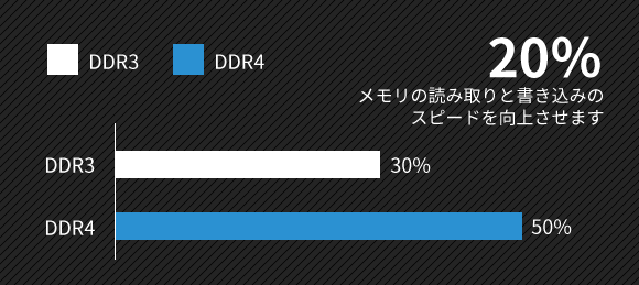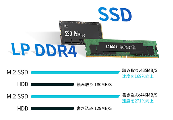 メモリは、LPDDR3よりスピードを20%向上させたDDR4を搭載し、4GB・8GBのメモリでWebブラウジング、文書作成、音楽再生など、複数のタスクを同時に実行できます。