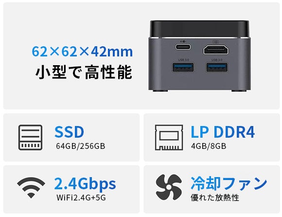 また、データ読み書き速度が速く、HDDよりも静音で発熱しにくいM.2 2242 SSDストレージが内蔵されています。リターンでは64GB・256GBのSSDストレージからお選びいただけますので、一般的な使い方であれば容量不足もほぼ心配ありません!